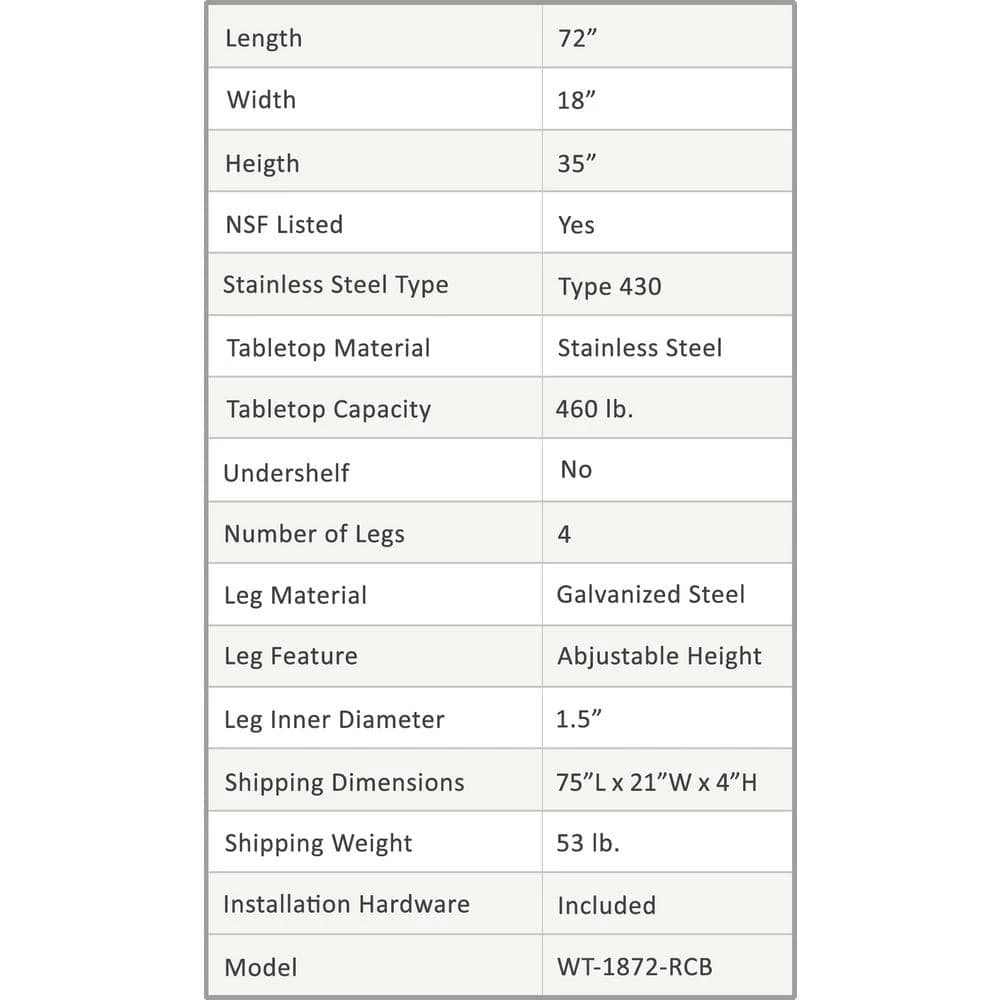 • This heavy-duty industrial quality multi-purpose stainless steel utility table is a great fit for a variety of commercial and residential applications such as commercial kitchens, garages, labs, laundry room, etc The tabletop is made with 18 gauge 430 stainless steel The bottom shelf and the legs are made with galvanized steel. Adjustable bullet feet allow to improve stability on uneven floors and prevent the floor from being scratched.