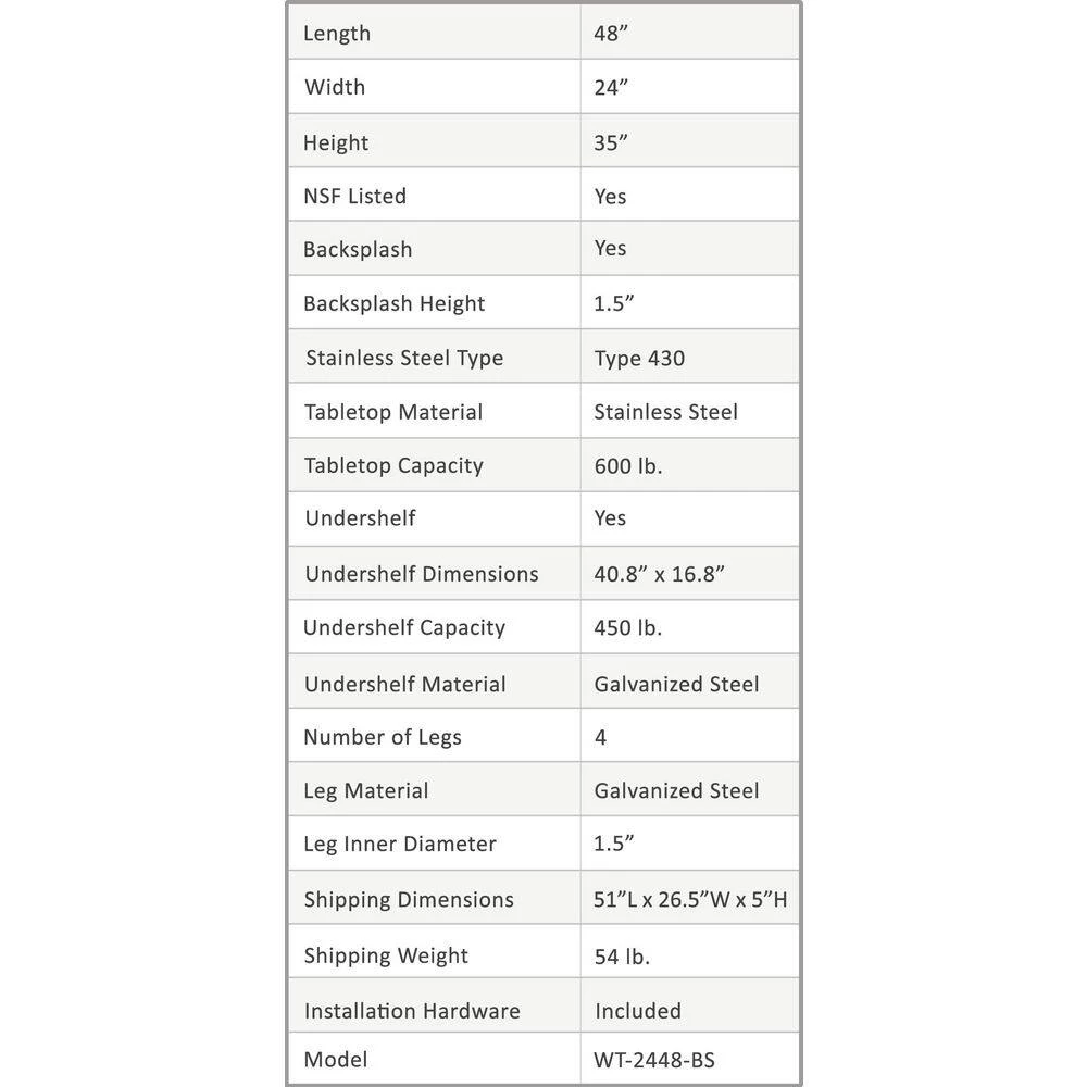 Common Applications:Food Prep Table For Commercial KitchenKitchen IslandCounter ExtensionUtility Bench for ShopProfessional Work StationGarage Work BenchLaundry Clothes Folding TableBrewing SetupExam Table For VeterinariansButcher ShopProduct SpecificationsStainless steel work table surface has curved edges for safety and comfort. It incorporates a heavy duty adjustable galvanized bottom shelf and leveling feet.18 Gauge 430 Stainless Steel TopGalvanized Adjustable bottom shelfAdjustable feet to compensate for uneven floorAdjustable under shelf – great for storageHeight: 35″NSF CertifiedSturdy & easy to setupHeavy Duty