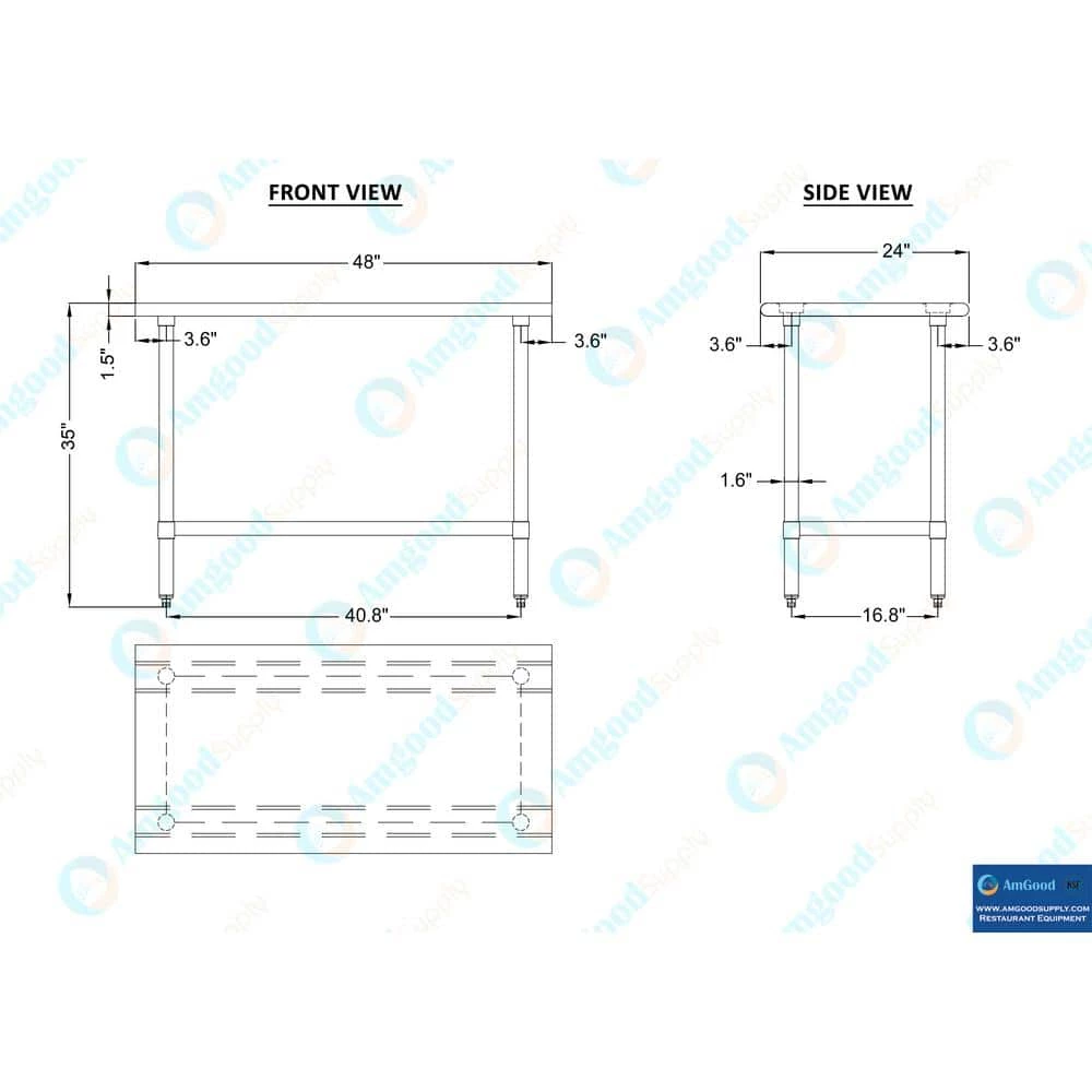 Stainless Steel Work Table with Galvanized Under Shelf Common Applications: Food Prep Table For Commercial Kitchen Island Counter Extension Utility Bench for Shop Professional Work Station Garage Work Bench Laundry Clothes Folding Table Brewing Setup Exam Table For Veterinarians Butcher Shop Product Specifications Stainless steel worktable surface has curved edges for safety and comfort.It incorporates a heavy Duty. adjustable galvanized under shelf and leveling feet.18 Gauge 430 Stainless Steel Top Galvanized Adjustable Under Shelf Adjustable feet to compensate for uneven floor Adjustable under shelf – great for storage Height: 35 in.NSF Certified Sturdy and easy to setup Heavy Duty. Am Good Supply prides itself of being a one stop shop for all of your restaurant supply needs.Am Good Supply offers a wide selection of stainless steel work tables with galvanized legs and undershelf.All work tables are made with T-430 18-gauge stainless steel, designed to be easily assembled, and are NSF certified.Stainless steel work tables are commonly used for food prep in a commercial kitchen, as a work desk, assembly line table, work bench, and in many other residential, commercial and industrial applications.Am Good Supply work tables are known for their premium quality and economy prices.