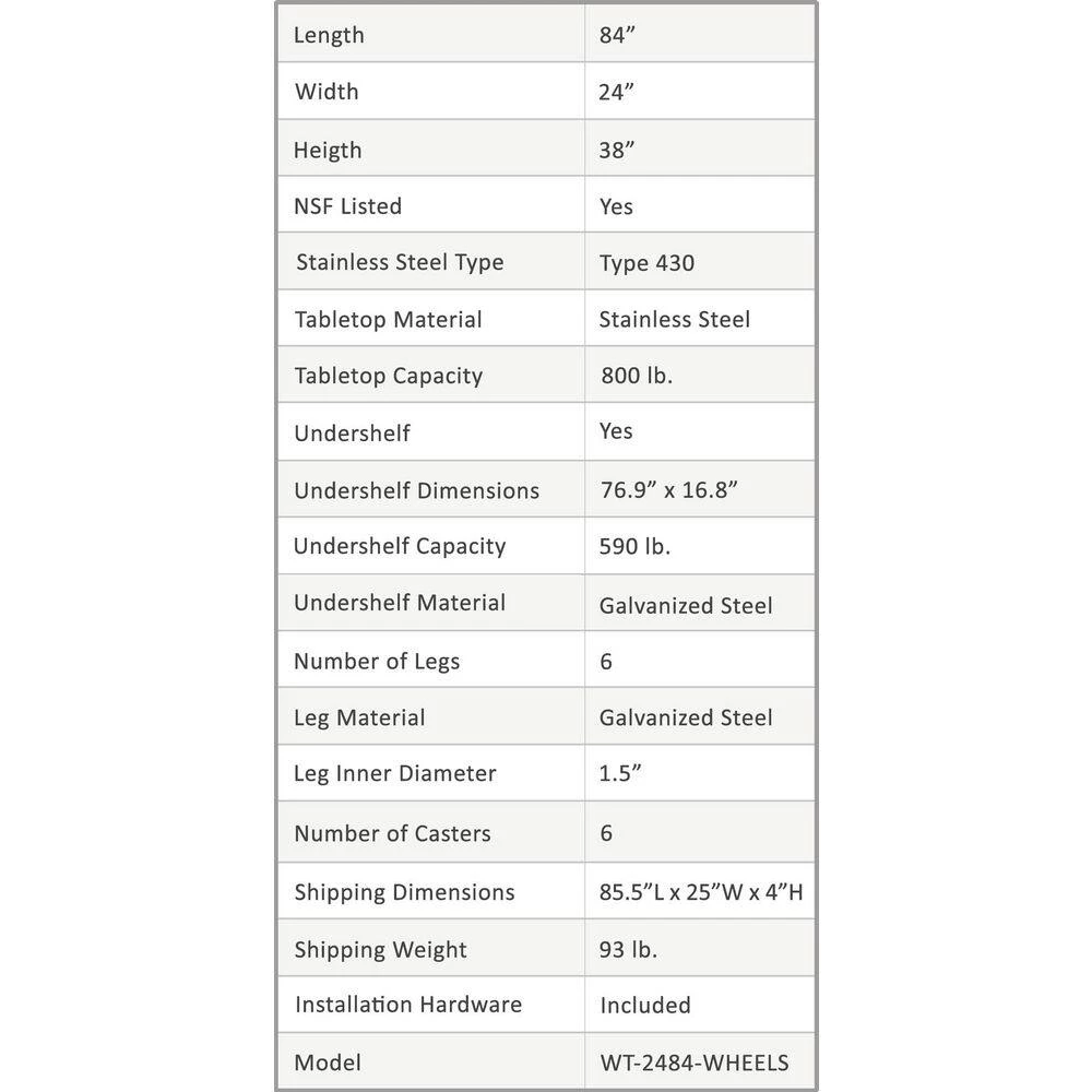 A Stainless Steel Utility Work Table with Wheels is a great addition to any home or business.It is perfect for a variety of tasks, including a workbench, prep table, or general-purpose.table. The included bottom shelf provides additional storage space.Some assembly is required. NSF certification allows the table to be used in any food service environment. The table is made with corrosion resistant 430 stainless steel top and galvanized legs and bottom shelf.It’s built to withstand heavy use. and everyday wear and tear.Whether you need a sturdy workspace for your next DIY project or simply want an extra prep area in the kitchen, this utility table has you covered. Common Applications: Food Prep Table For Commercial Kitchen Kitchen Island Counter Extension Utility Bench for Shop Professional Work Station Garage Work Bench Laundry Clothes Folding Table Brewing Setup Exam Table For Veterinarians Butcher Shop Product Specifications Mobile stainless steel work table surface has curved edges for safety and comfort.It incorporates a heavy Duty. adjustable galvanized bottom shelf and leveling feet. 18 Gauge 430 Stainless Steel Top Galvanized Adjustable bottom shelf Adjustable feet to compensate for uneven floor Adjustable under shelf – great for storage Includes a set of 4 casters for easy mobility.Two of which are locking Height: 35″ + 3″ Casters NSF Certified Sturdy and easy to setup Heavy Duty.