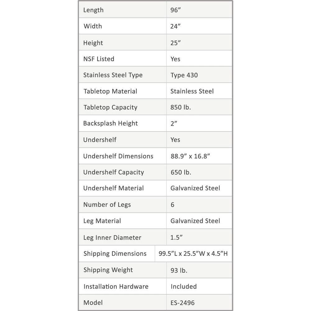 - 18 Gauge, T-430 Stainless Steel Top. Galvanized Under Shelf and Legs. Adjustable bullet feet.