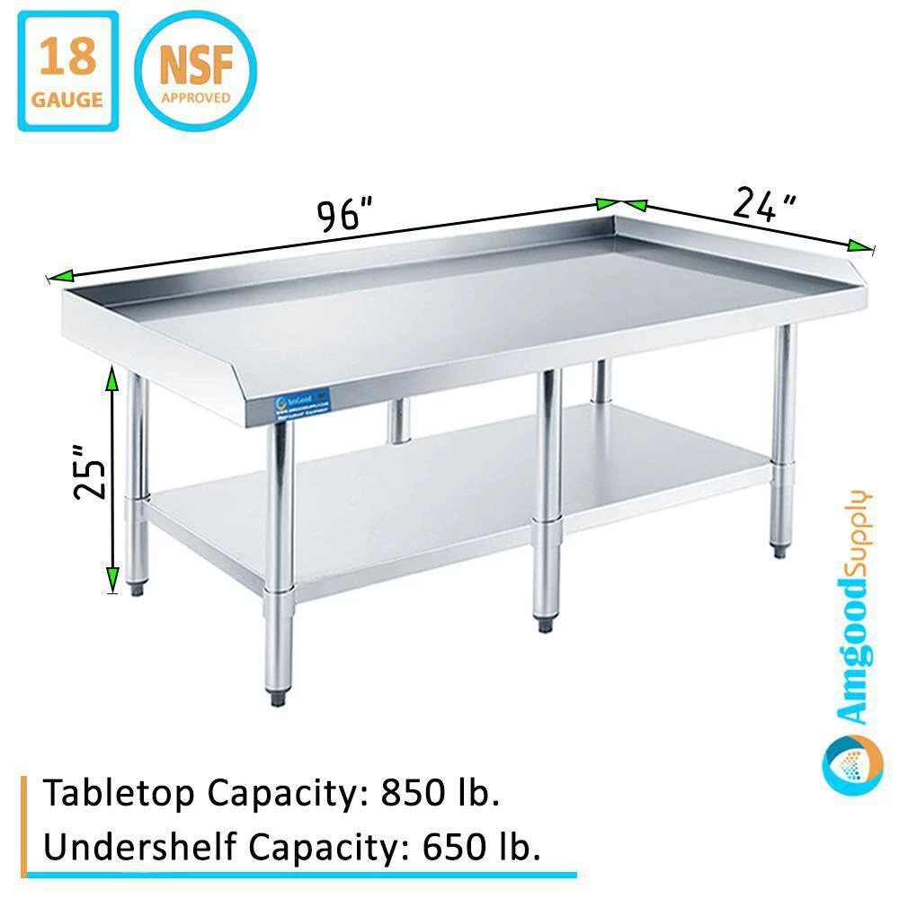 AmGood Stainless Steel Equipment Stand18 Gauge, T-430 Stainless Steel Top. Galvanized Under Shelf and Legs. Adjustable bullet feet.Features 1″ Upturn on 3 Sides To Protect Your Walls from Scratches & Liquid Waste. Top reinforced with welded-on hat channel. All Edges are Finished to Provide Safety to Staff and EquipmentSuitable For Commercial Kitchen Cooking Line Equipment, Slushy Machines, beverage dispensers, ice cream machines, etc. Heavy Duty Construction Allows for Many Years of Durable Use.All Equipment Stands are Packaged & Shipped According To Industry’s Best Practices to Ensure Damage-Free Flawless Delivery and Highest Level of Customer Satisfaction.NSF Certified.