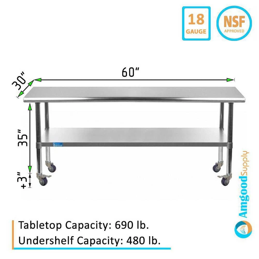 30 in. x 60 in. Stainless Steel Work Table with Casters : Mobile Metal Kitchen Utility Table with Bottom Shelf by AMGOOD