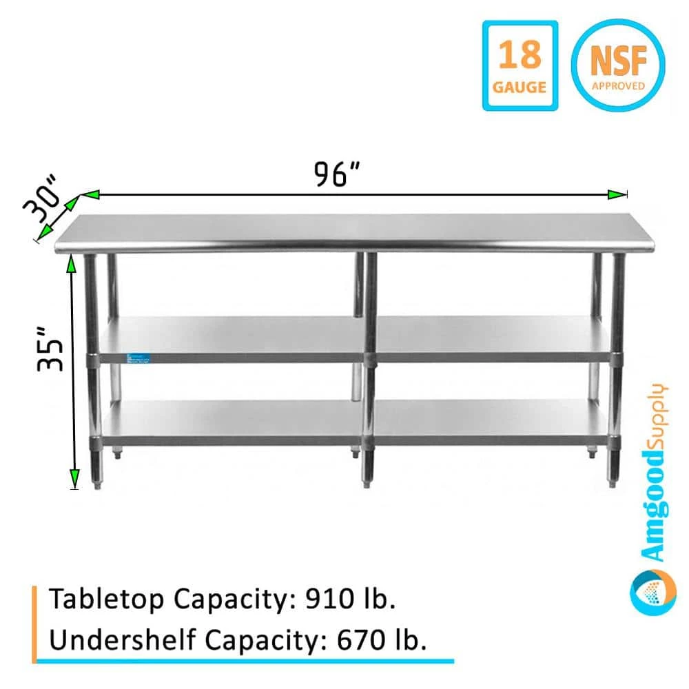 Stainless Steel Work Table With 2 Galvanized Under Shelves Common Applications: Food Prep Table For Commercial Kitchen Kitchen Island Counter Extension Utility Bench for Shop Professional Work Station Garage Work Bench Laundry Clothes Folding Table Brewing Setup Exam Table For Veterinarians Butcher Shop Product Specifications Stainless steel worktable surface has curved edges for safety and comfort. It incorporates a heavy duty adjustable galvanized under shelf and leveling feet. 18 Gauge 430 Stainless Steel Top 2 Galvanized Adjustable Under Shelves Adjustable feet to compensate for uneven floor Adjustable under shelf – great for storage Height: 35″ NSF Certified Sturdy & easy to setup Heavy Duty AmGood Supply prides itself of being a one stop shop for all of your restaurant supply needs. AmGood Supply offers a wide selection of stainless steel work tables with galvanized legs and undershelf. All work tables are made with T-430 18 gauge stainless steel, designed to be easily assembled, and are NSF certified. Stainless steel work tables are commonly used for food prep in a commercial kitchen, as a work desk, assembly line table, work bench, and in many other residential, commercial and industrial applications. AmGood Supply work tables are known for their premium quality and economy prices.