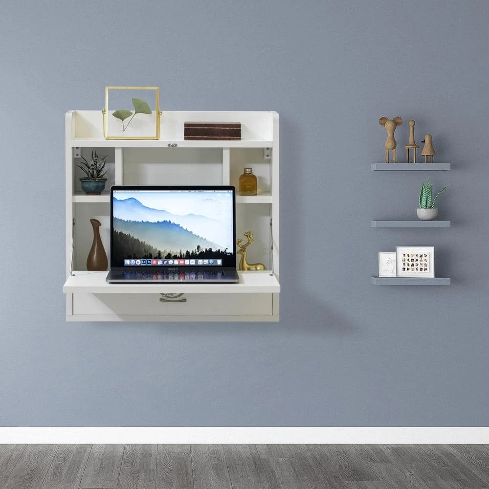Maximize your home office space and functionality with the Wall Mounted Office Desk. This clever storage solution packs in a spacious desktop, six storage shelves and a pull out drawer, all within a sleek wall mounted cabinet that folds up when not in use. Made with durable material, the folding desk is durable, sturdy, and easy to clean. Everything you need for assembly and installation is included, and the assembly guide makes it easy to set up. A built in latch keeps the tabletop in place when folded up, so it can be safely closed. Its compact size is perfect for home office, study, or makeup storage desk.