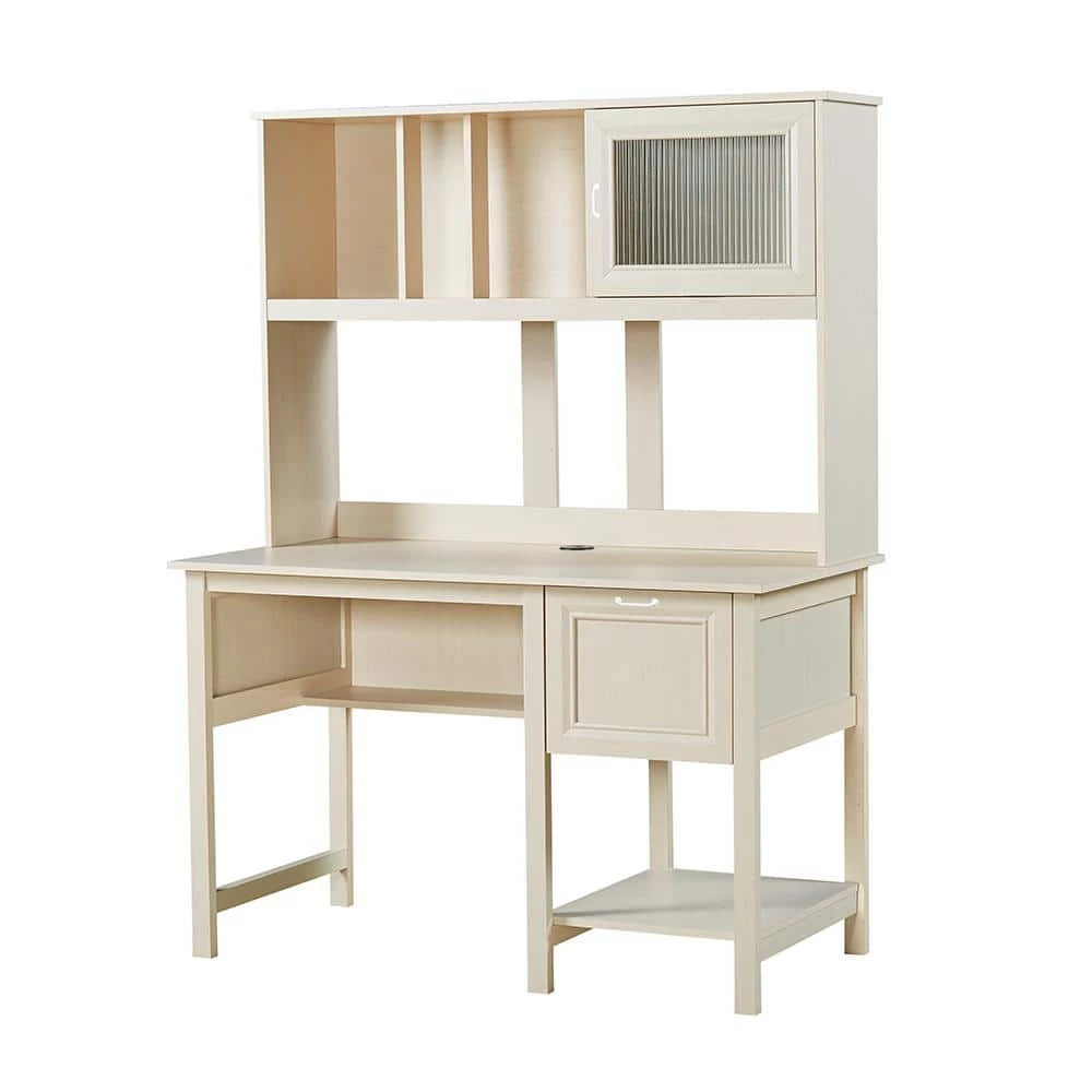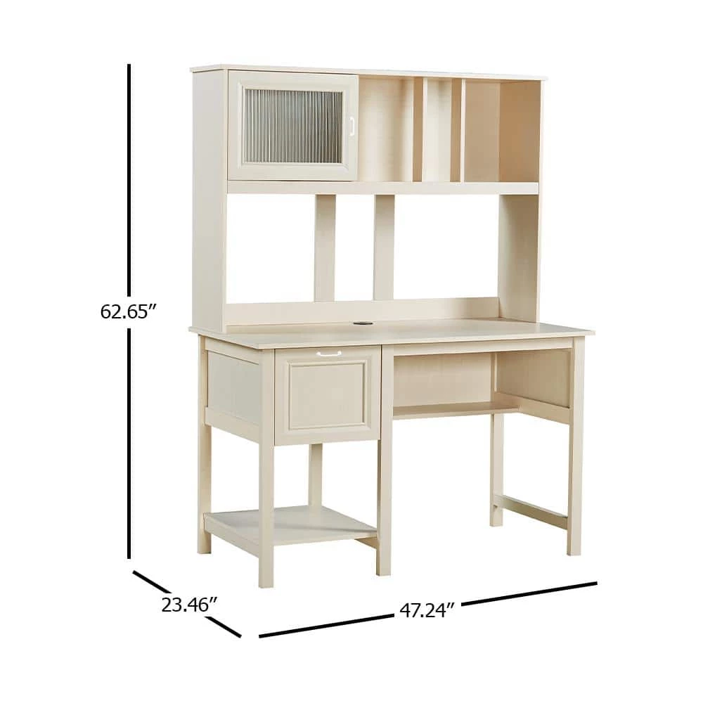 Whether working from home or studying for an exam, this contemporary desk and hutch make your tasks that much more enjoyable. Boasting an antique white finish with light distressing, this desk is right at home in a casual living space or home office. It offers plentiful storage with a file drawer, multiple shelves and an upper cabinet complete with a charming ribbed glass front. Charming edge details pair with high quality hardware and decorative pulls to create a piece that looks great and functions beautifully.