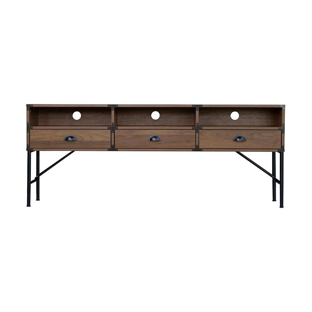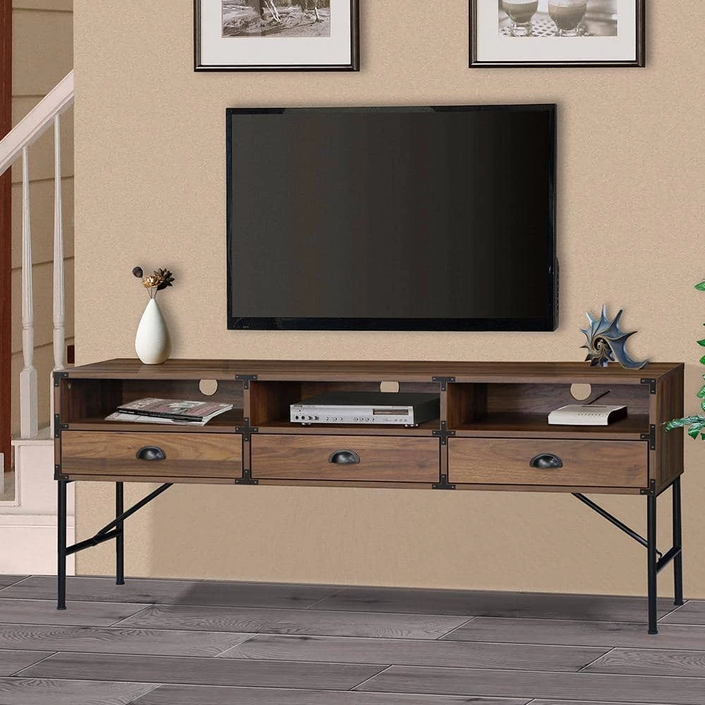From the Brunei collection, this charming industrial TV stand is a character-rich focal point for your entertainment center. It offers a classic walnut finish with cupped drawer pulls that add modern farmhouse appeal. Three shelves and three drawers deliver all the storage you need for everything from a gaming console to a DVD player to remotes and accessories. A slim metal frame add support while lightening the overall look of the media console.