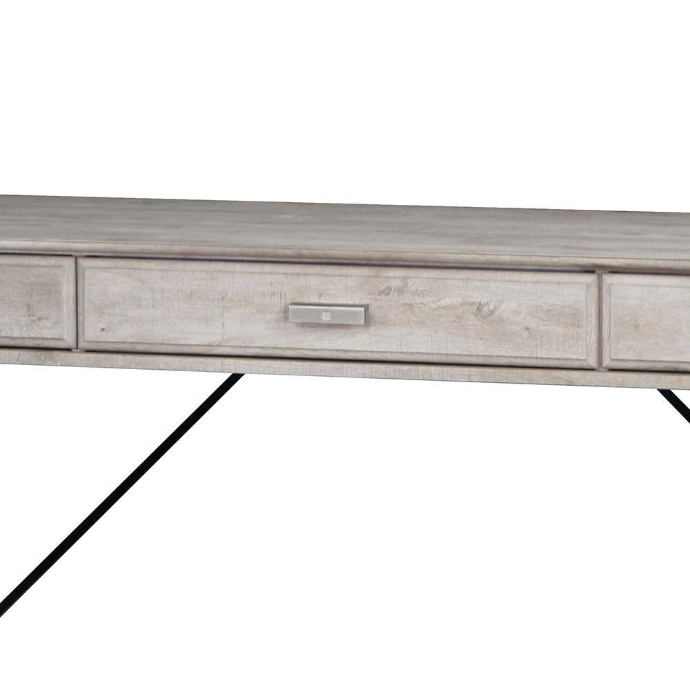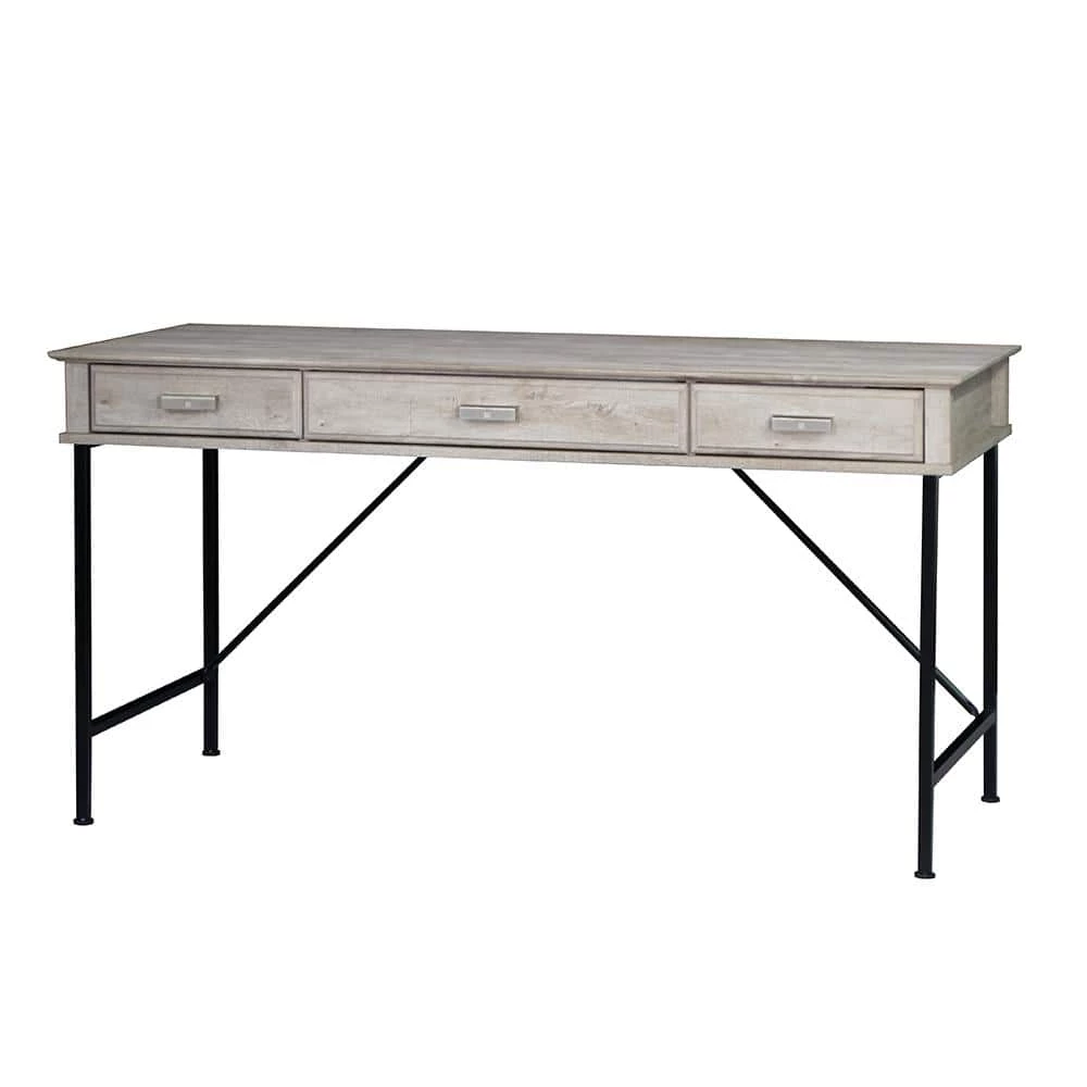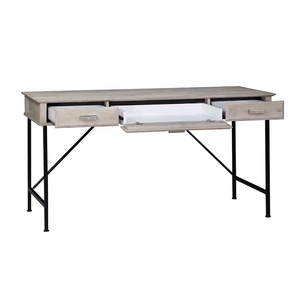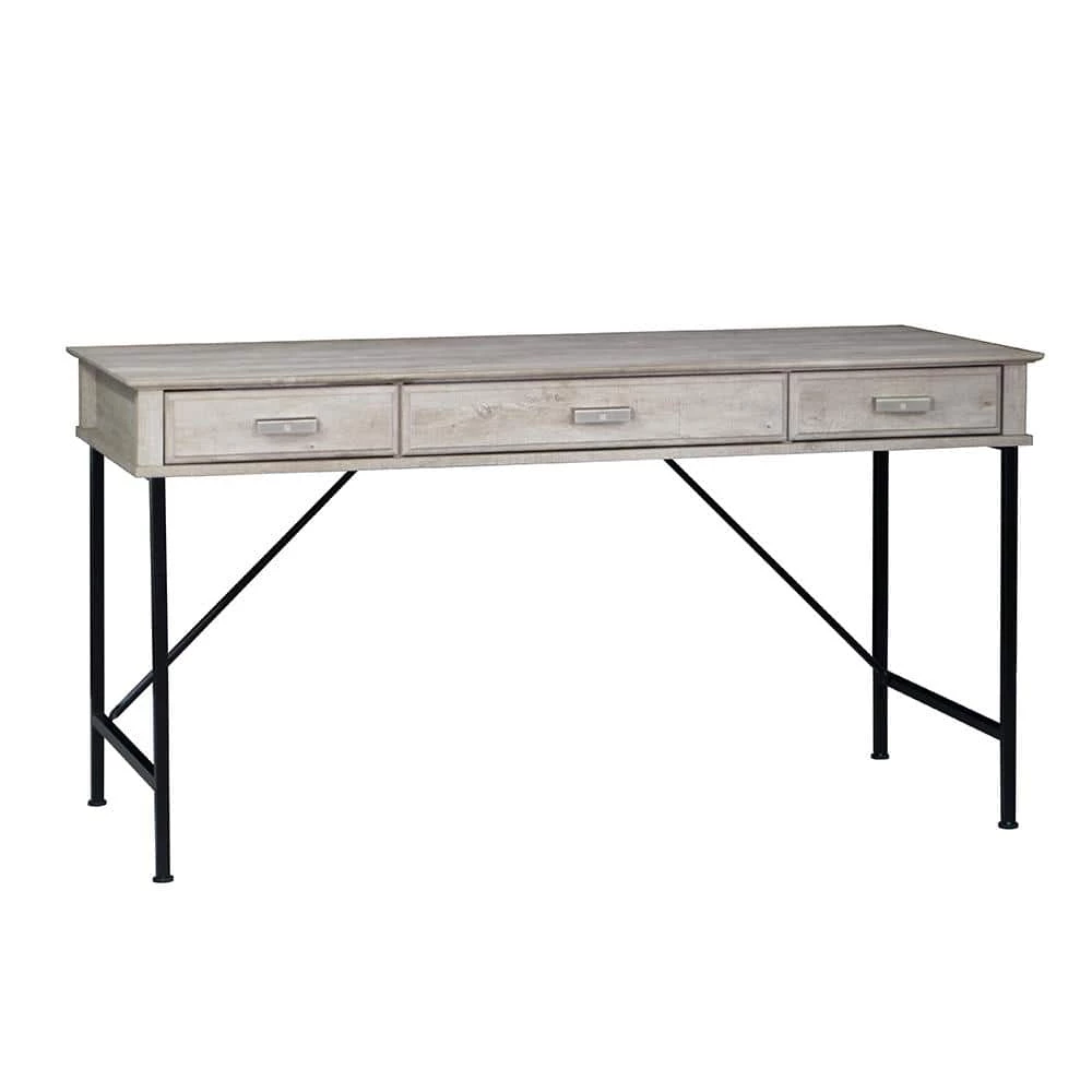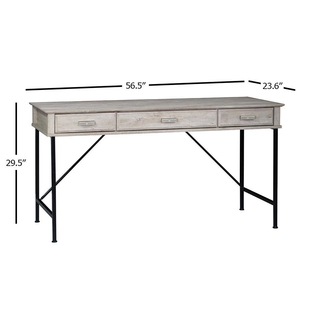 Take a spin in a farmhouse direction in your bedroom or living area with this charming rustic writing desk. Featuring a metal frame with angled accents, the desk includes three slim drawers to keep essentials tucked away and organized. It shows off a washed gray wood finish that encourages casual ambiance in contemporary or modern farmhouse decor. This compact design offers plenty of space for homework, projects or working on a laptop.