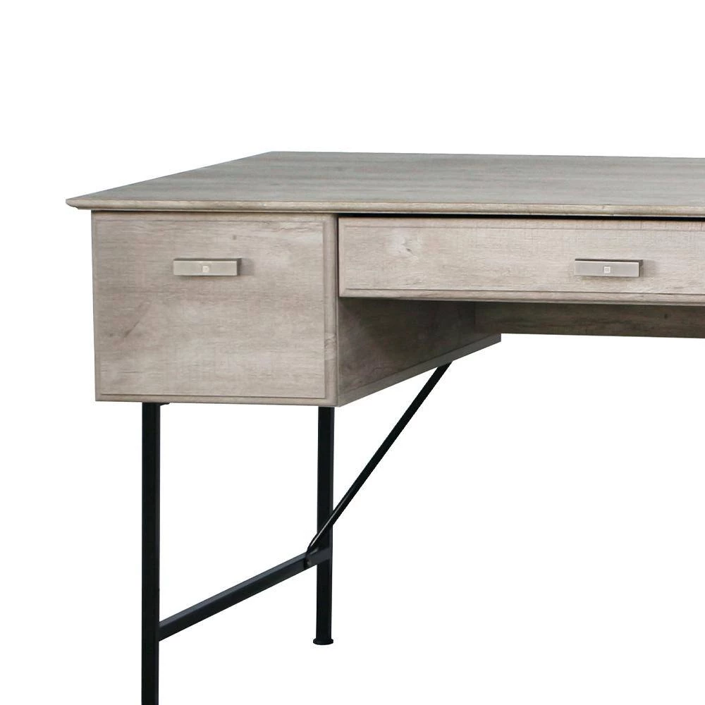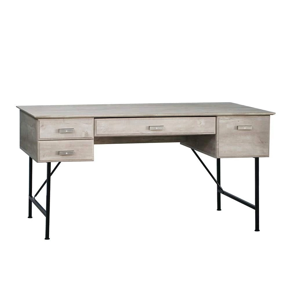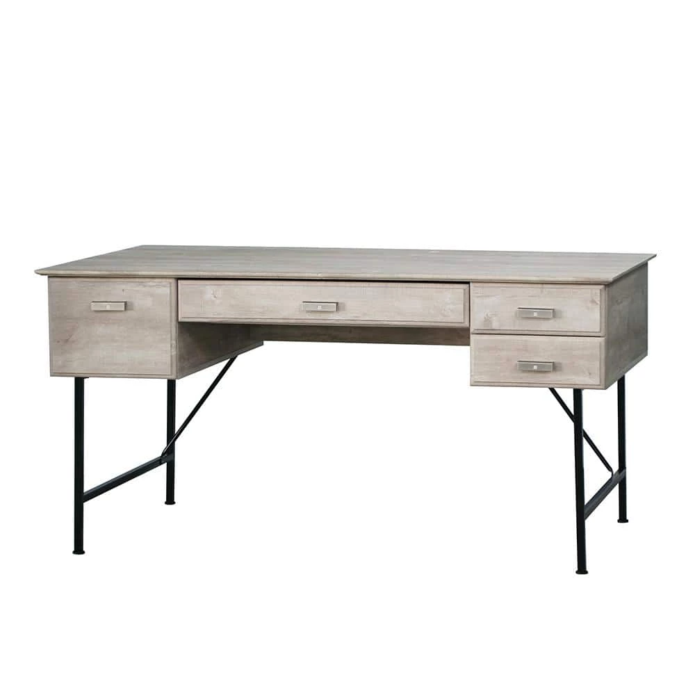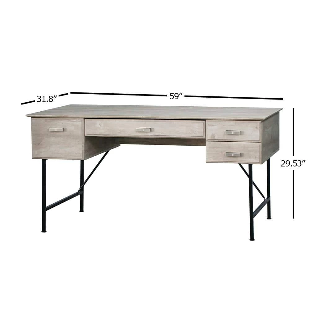 Put a decidedly farmhouse spin on your home workspace with this charming rustic writing desk. Featuring a metal frame with angled accents, the desk includes four drawers to keep essentials tucked away and organized. Its washed gray wood finish sets a casual ambiance, encouraging a modern farmhouse aesthetic to offering a relaxed touch to contemporary decor. The wide, deep desktop provides plenty of space for a computer, notebook and other necessities.