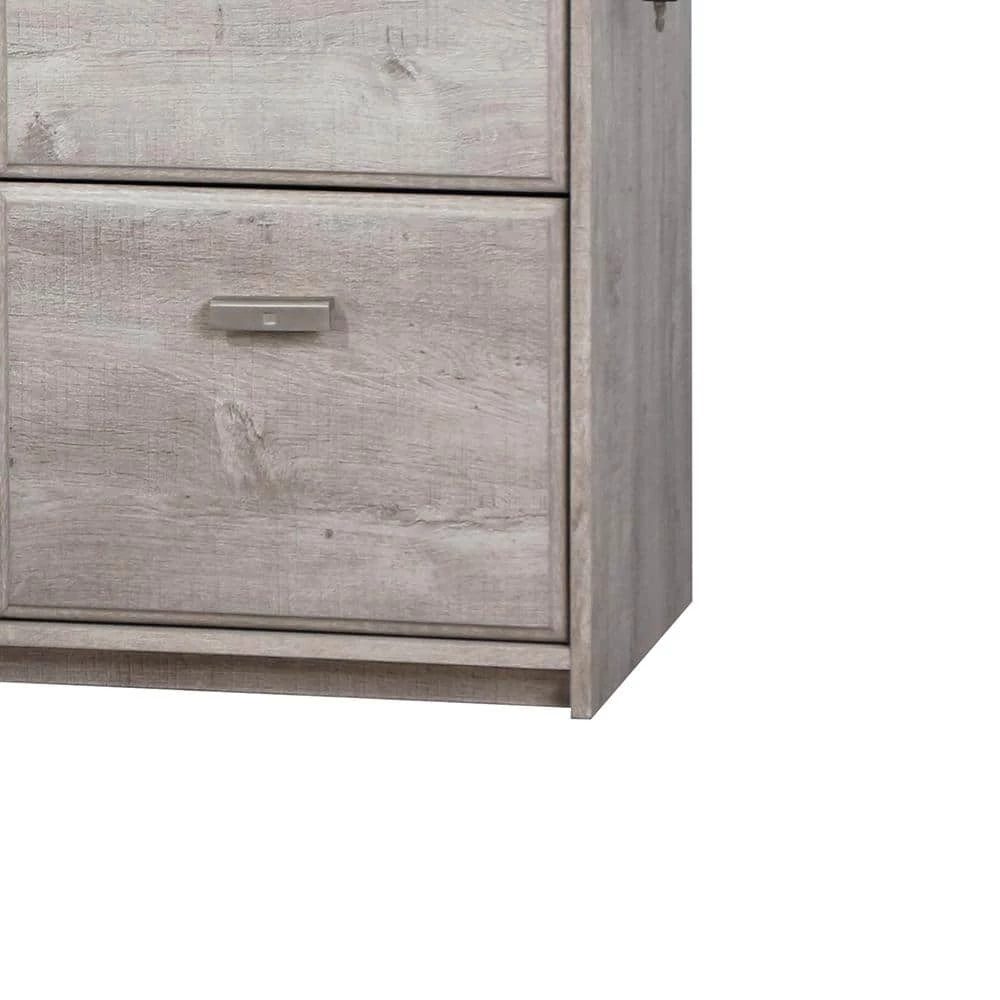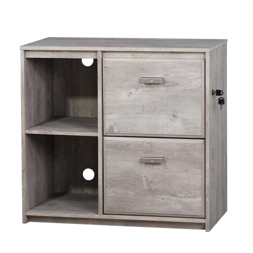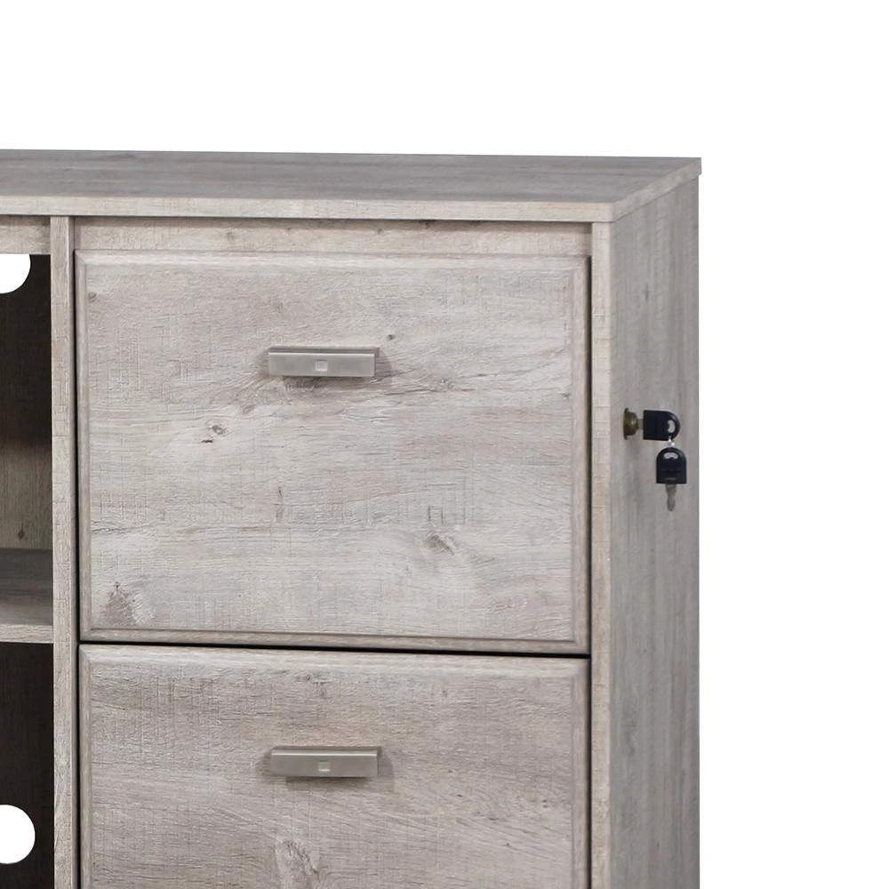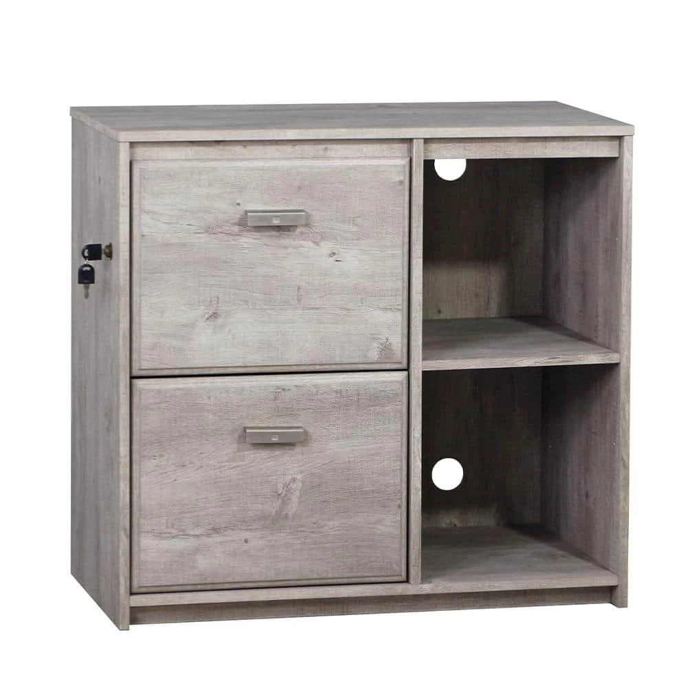 Create a space for paperwork and home office electronics with this two-drawer and two-shelf filing cabinet. Featuring two generous file drawers, the cabinet adds a wide top and two shelves with cord management openings that make them as easy place to stash a printer or charging hub. It shows off a washed gray wood finish that encourages casual ambiance in contemporary or modern farmhouse decor. This multi-functional piece adds the convenience of both a file cabinet and a credenza in a single, compact package.