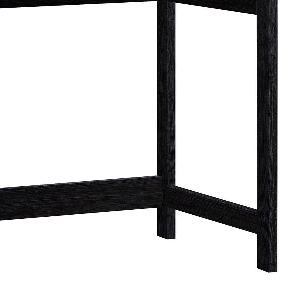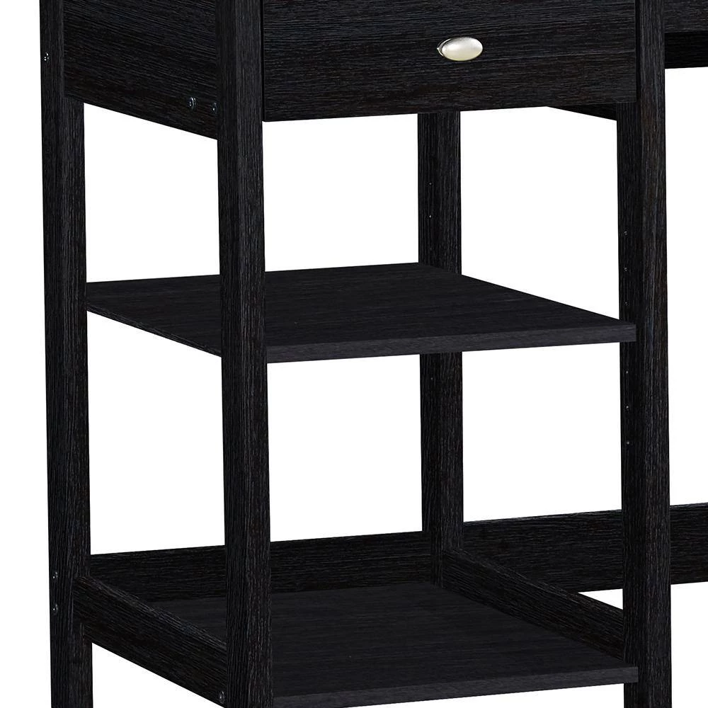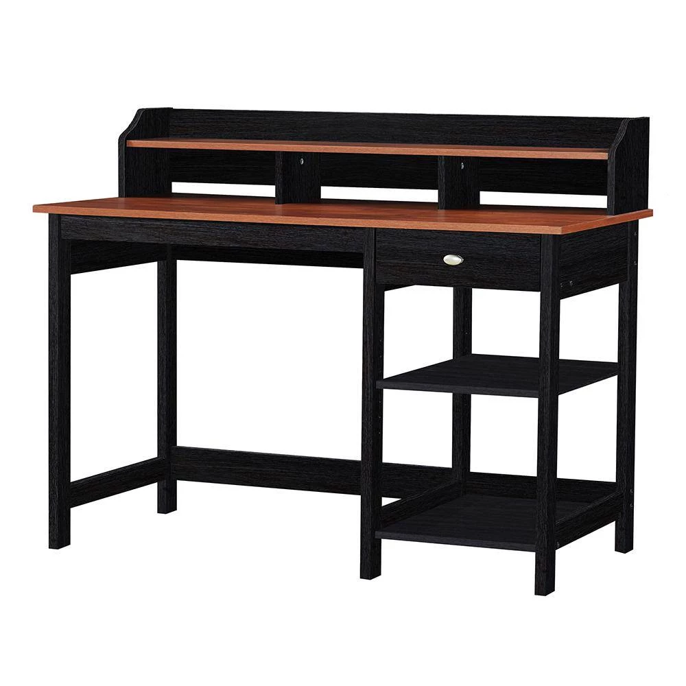An exceptional farmhouse writing desk and hutch set adds a delightful upgrade to your office space with its eye-catching warm teak and black oak finish. At 47 in. wide for the writing desk, there is plenty of space to organize your workstation essentials and accessories. Its bold farmhouse-inspired color palette and clean design make it ideal for setting the tone and creating a stylish focal point in your home workspace. Find two open shelves and a small drawer on the desk, along with one large open shelf and three divided compartments in the hutch for easy organization.