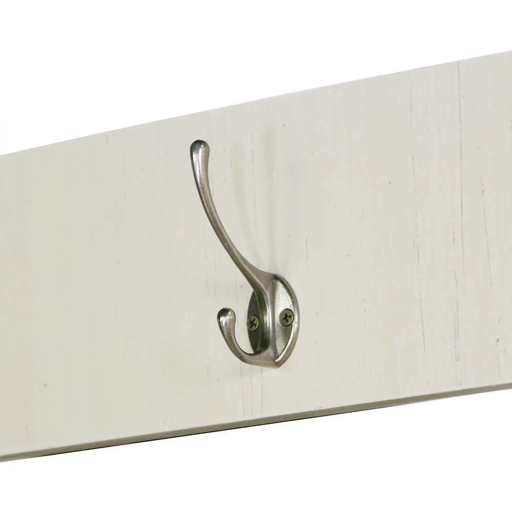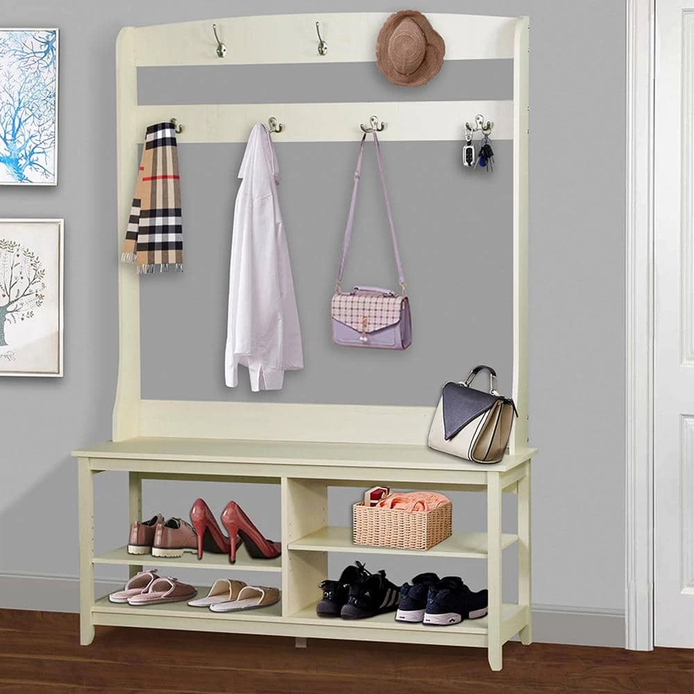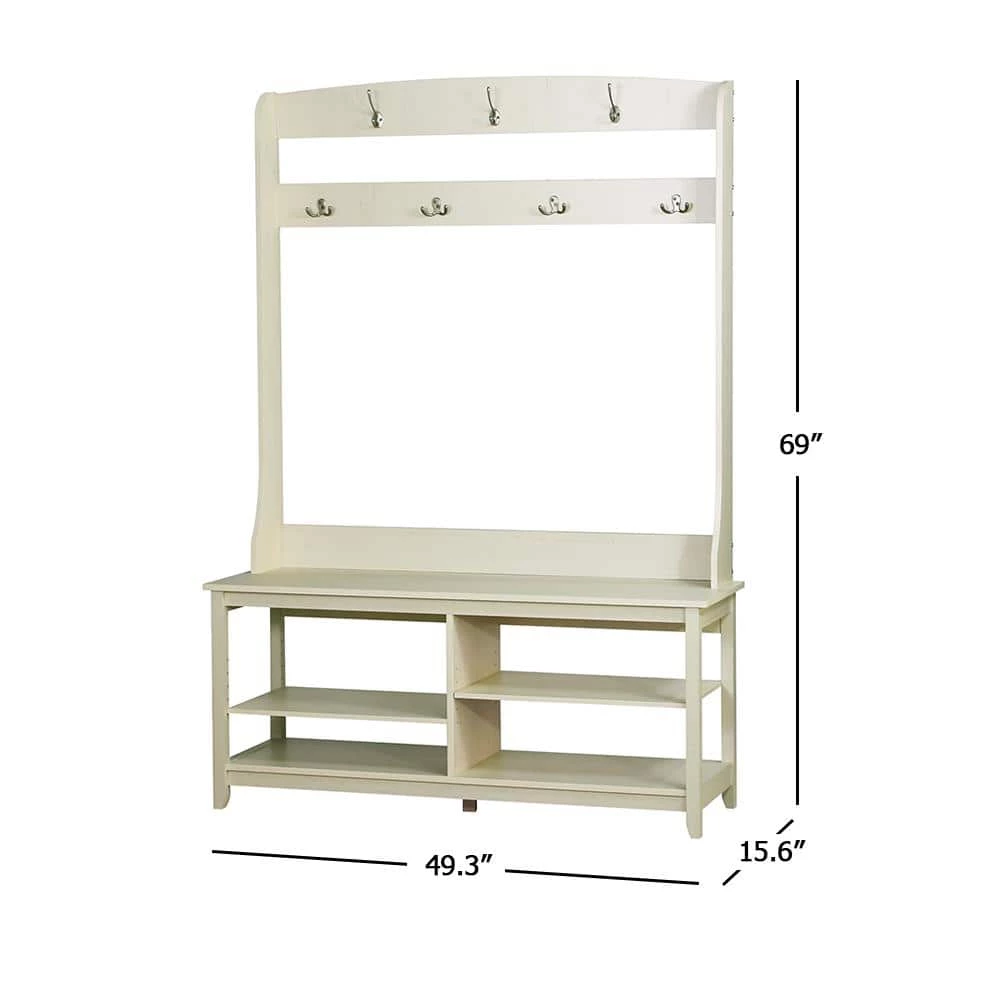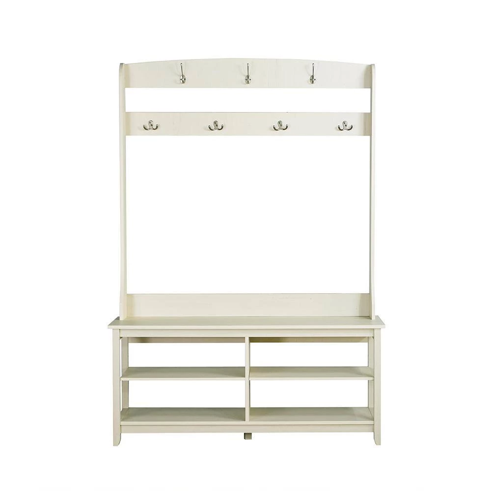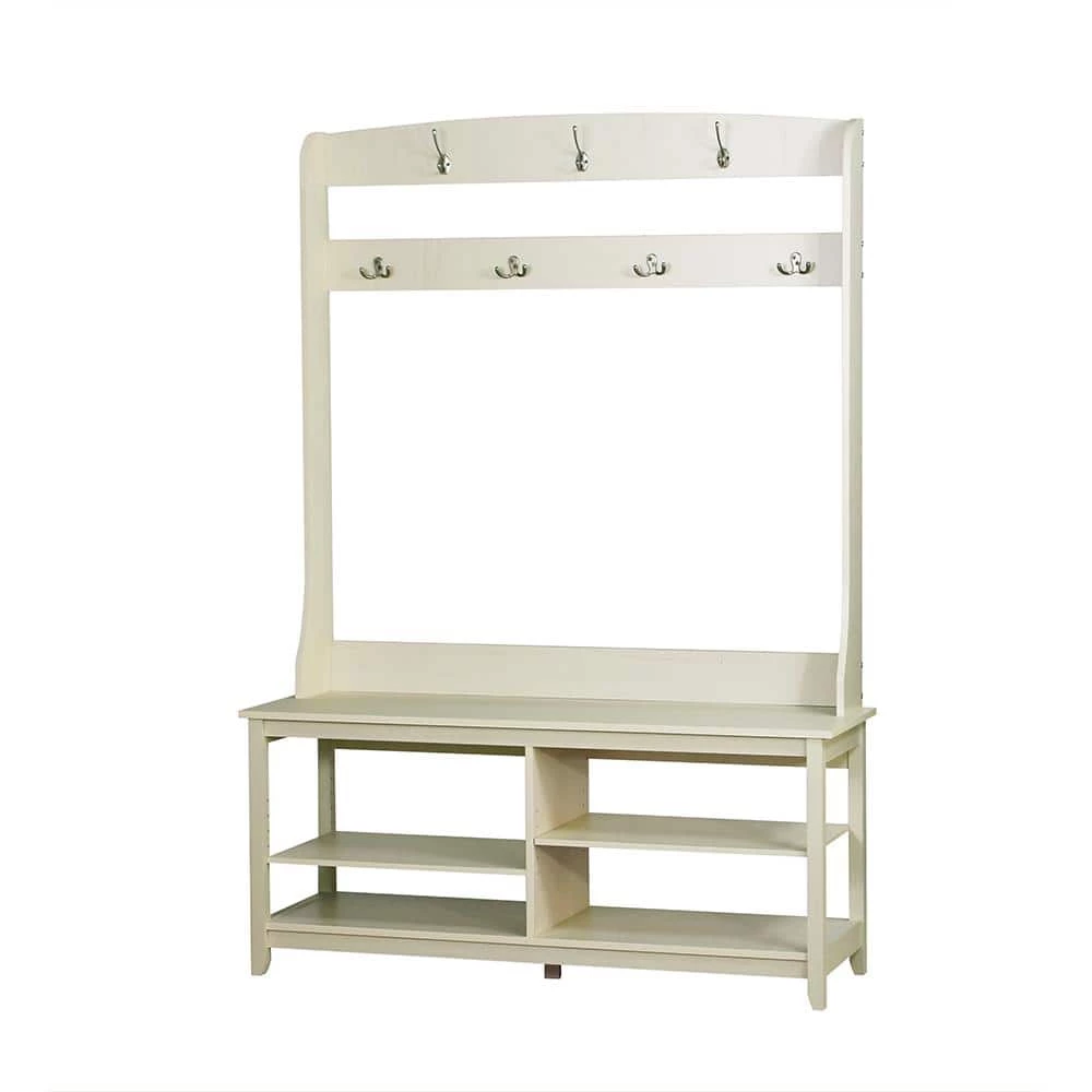 Anchor your entryway in an aspect of summer with this beautiful, white two-tier shelving and bench. Designed for easy seating so you can change shoes quickly, this product merges delicate taste with variable utility. The installed hangars are perfect for coats, hats, keys, and any other accessories you may want to store for easy access.