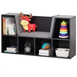 Black Modern Multi-Purpose Bookshelf with Storage Space and Gray Cushioned Reading Nook by Basicwise