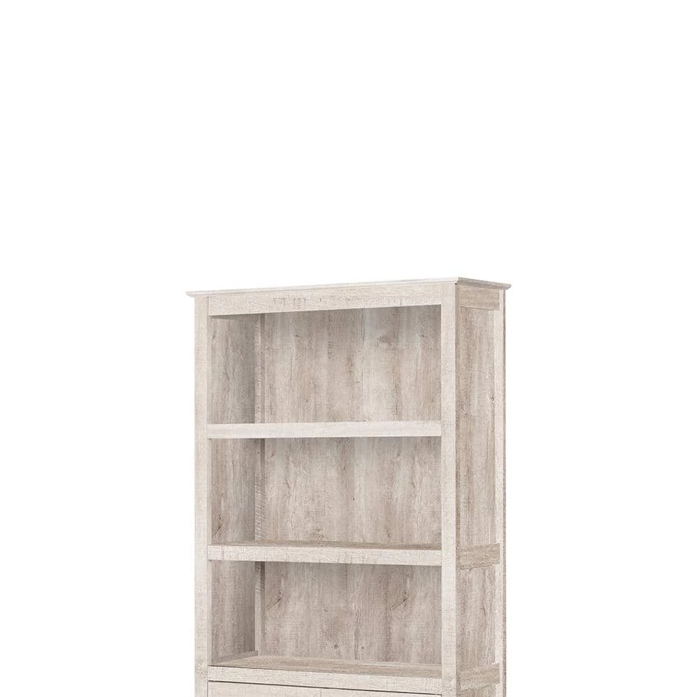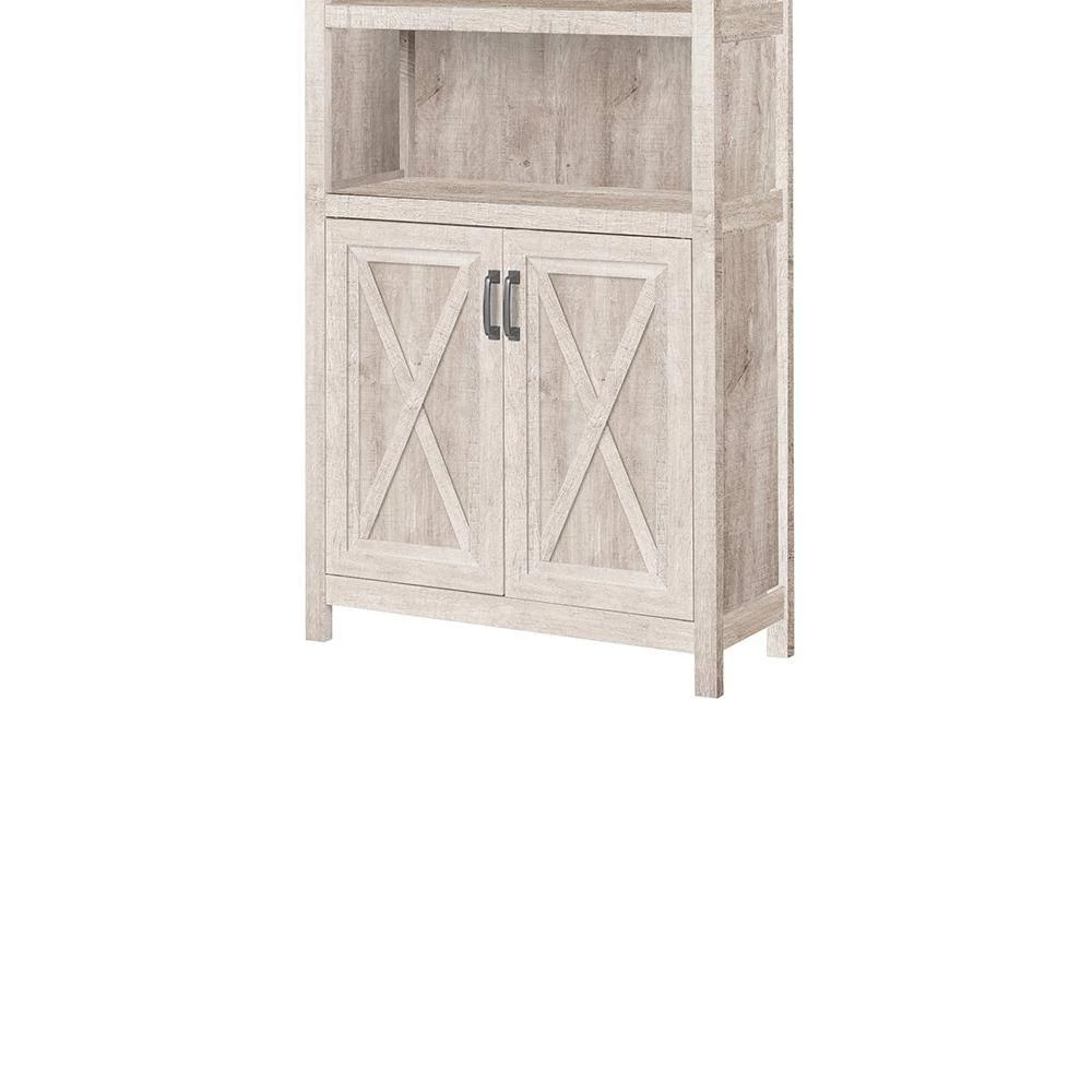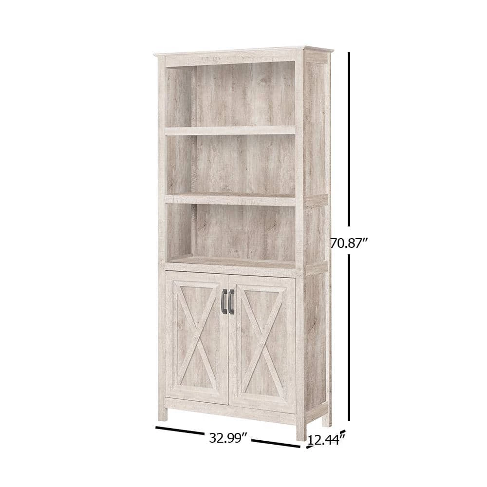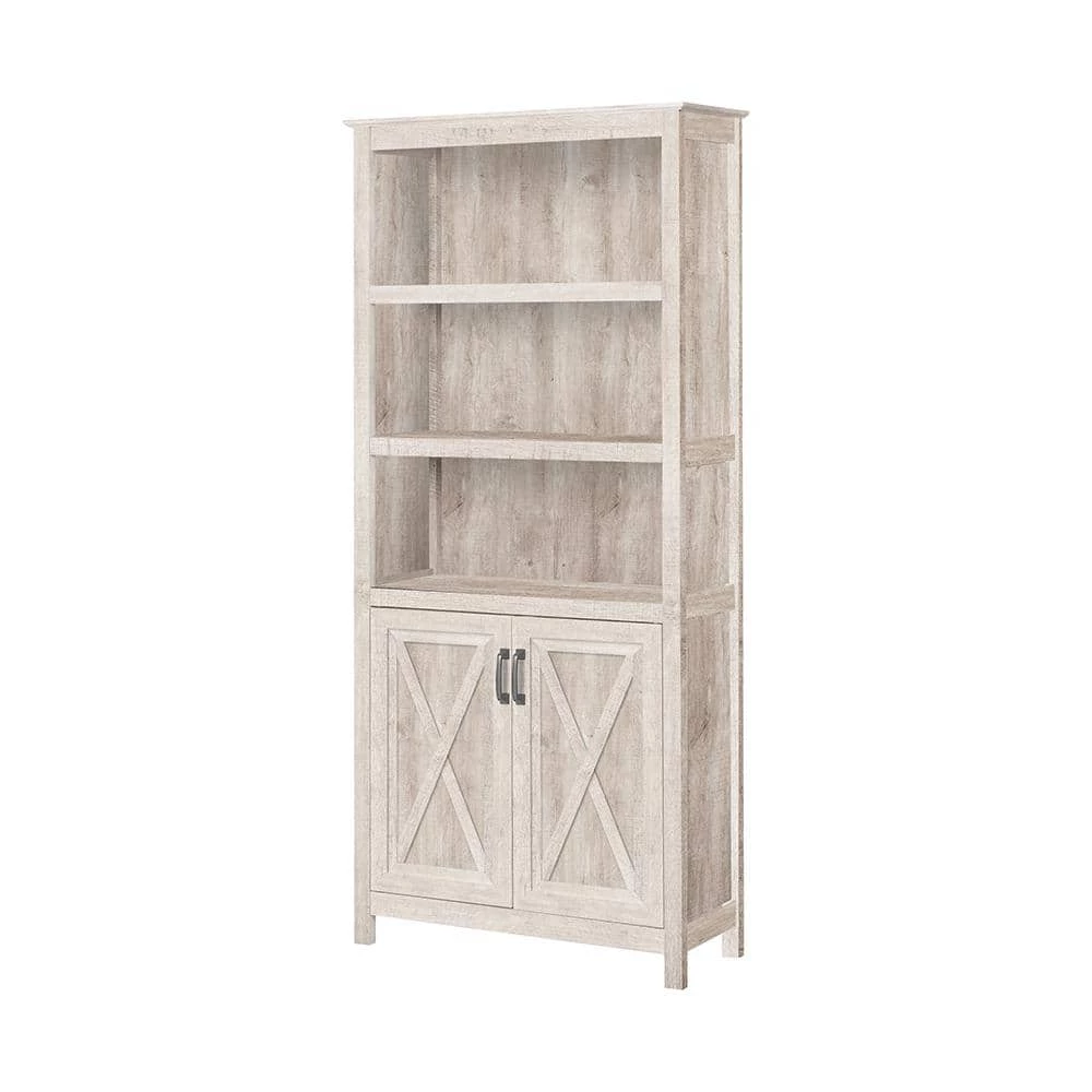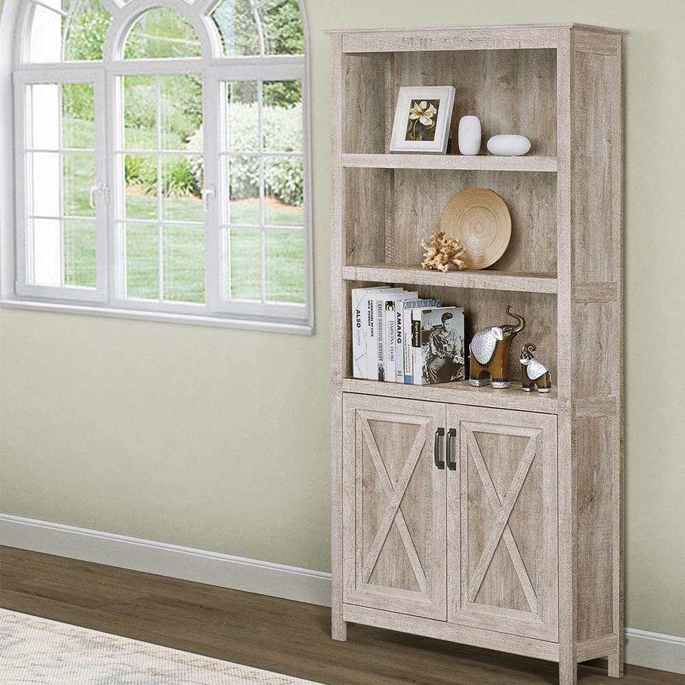 From the stylish Megan collection, this rustic contemporary two-door bookcase is the perfect addition to your office, bedroom, or living area. The versatile bookshelf is equipped with a lower two-door cabinet for concealed storage, while three upper shelves facilitate organization and display of books and personal mementos. The bookcase delivers on a relaxed look and feel with wood grain accents while X-cross details on doors add farmhouse flair. Tall and compact, this shelf adds ample storage with a minimal footprint that conserves space in any room.
