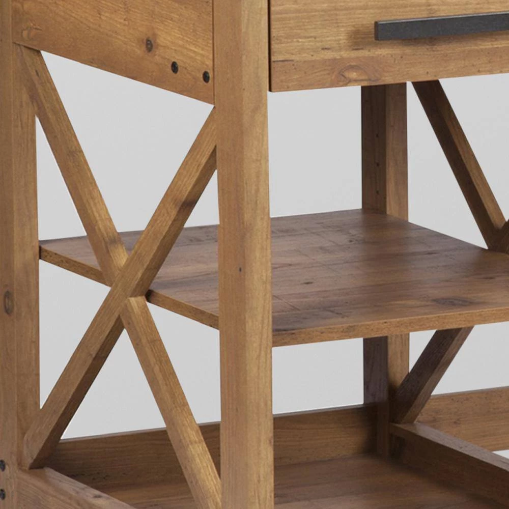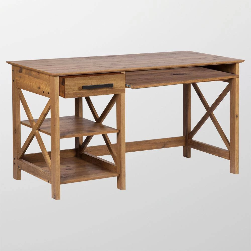 From the stylish Megan collection, this contemporary writing desk creates a comfortable and productive workspace anywhere in the home. The wooden vintage-inspired desk is equipped with one drawer, two open shelves, and a pull-out laptop credenza that create plenty of options for organization of essentials. Available in two finish options, the sturdy desk delivers on a relaxed look and feel and is complete with X-cross accents that add a hint of farmhouse flair. Create your home office around this rustic desk or simply add it to a living room study nook to create a wonderful workspace.