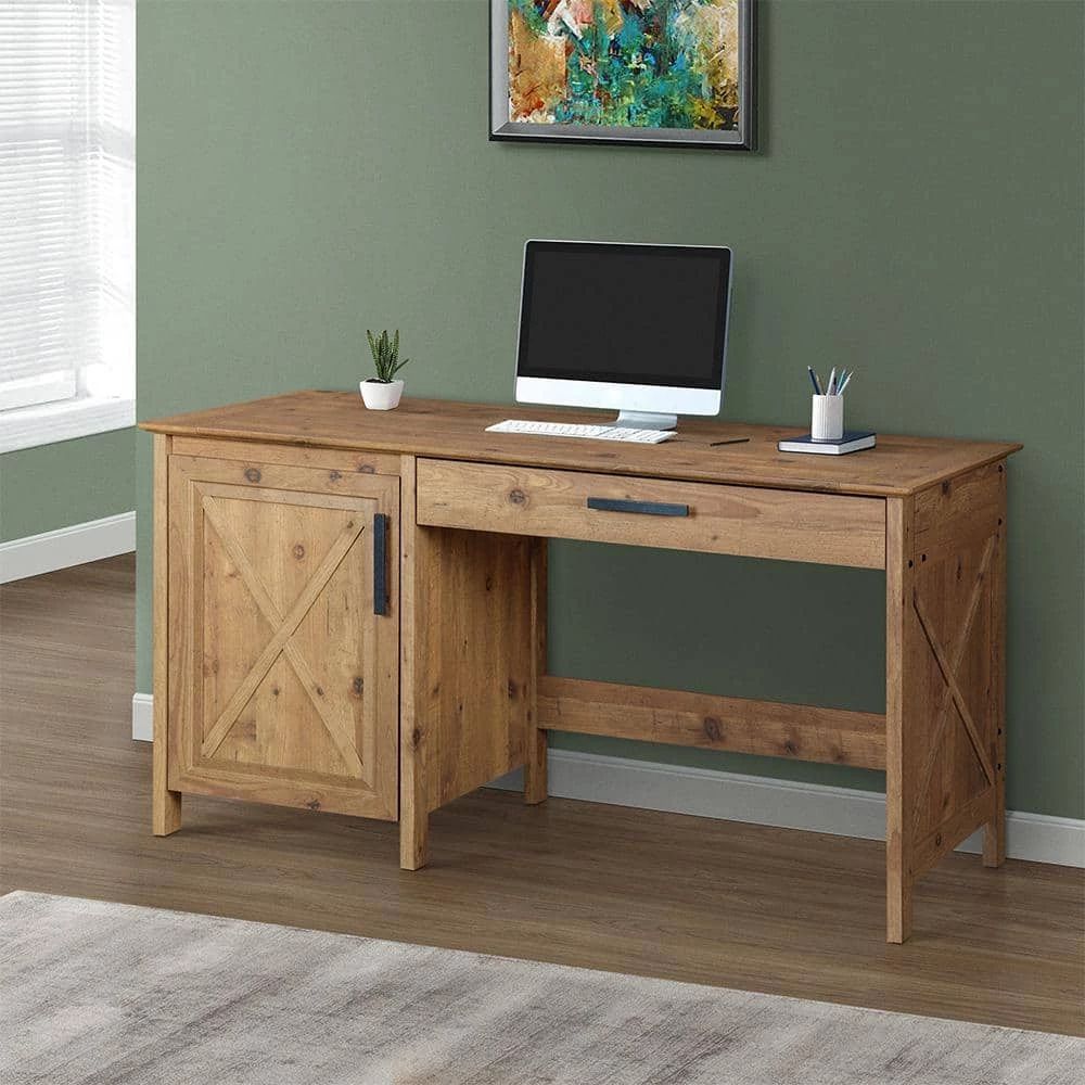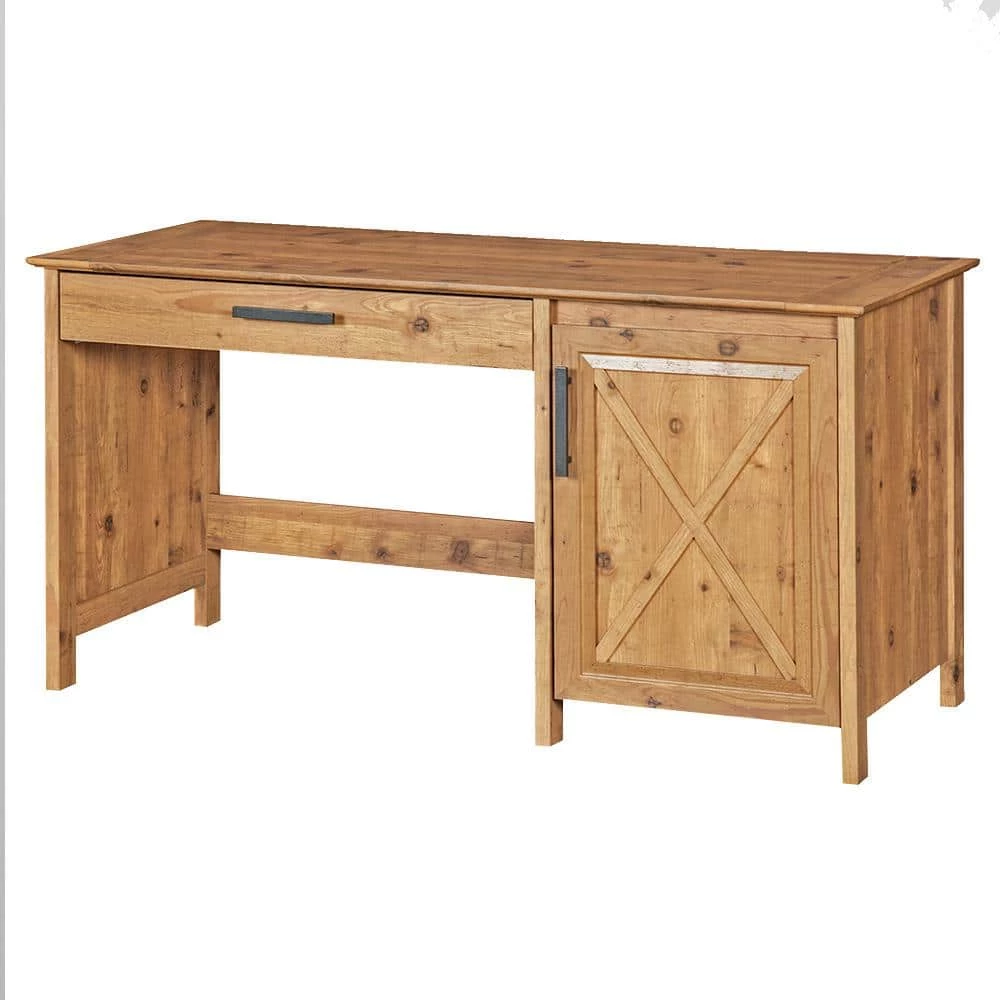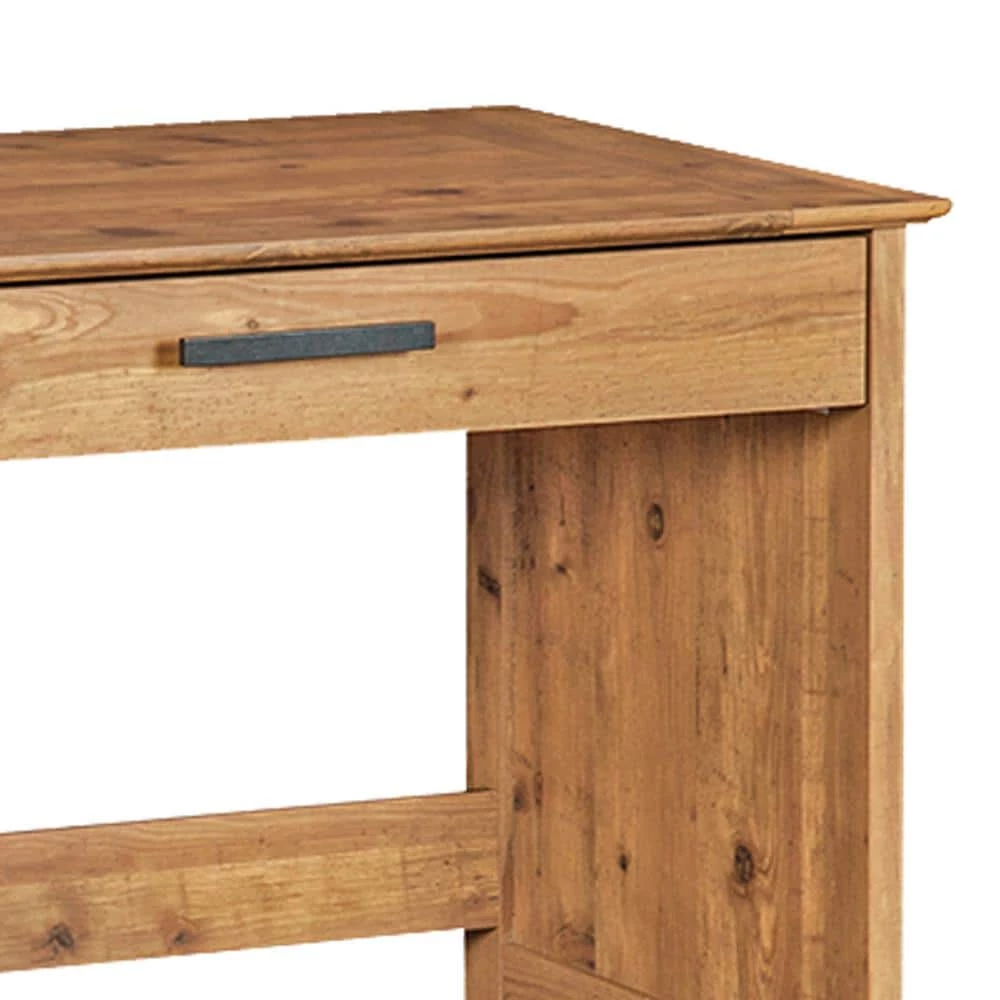 Handle basic tasks with ease and in style, choosing this country-inspired writing desk as a venue. Casual home offices and living spaces welcome this delightful desk and its warm rustic brown finish with wood knot designs that create authenticity. A wide surface is joined by a wide top drawer and a two-shelf cabinet with ample room for storage. Incorporate functional aspects of everyday living with the carefree, easy-going look of a farmhouse motif.