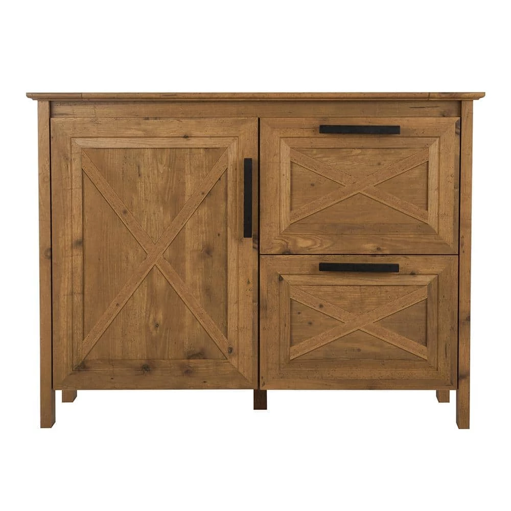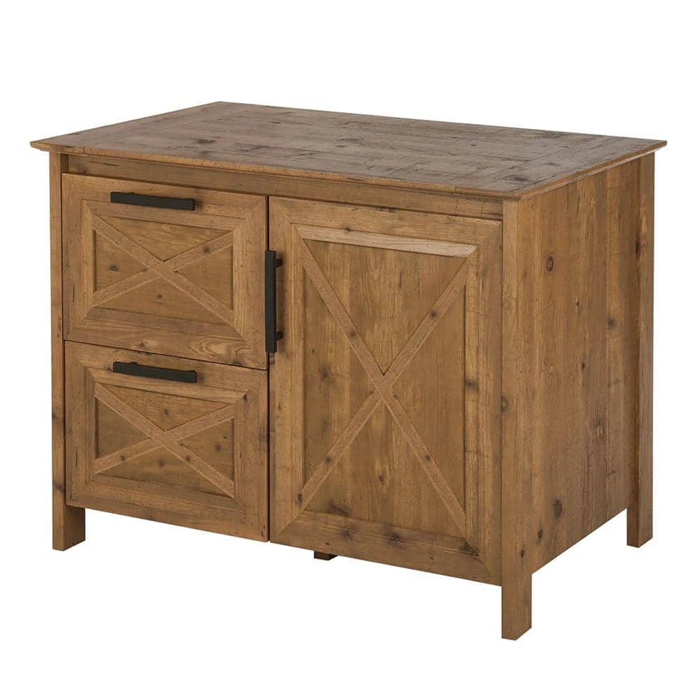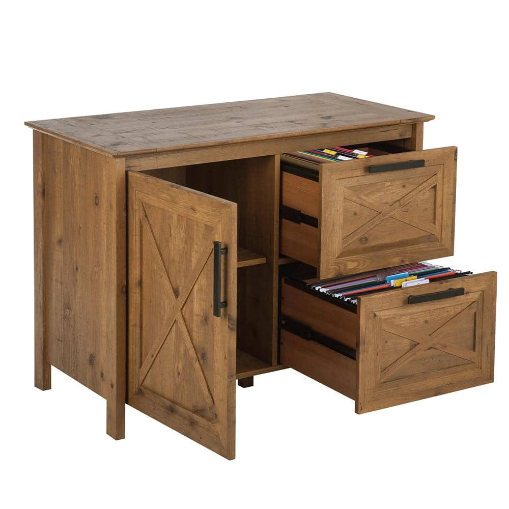 From the stylish Megan collection, this rustic contemporary filing cabinet is the perfect addition to your home office or professional business space. With a long top surface to store a printer, the wooden filing cabinet is also equipped with two deep lateral file-drawers and a spacious one-door cabinet to facilitate organization of essentials. The storage cabinet delivers on a relaxed look and feel with wood grain accents while X-cross metal details on door and-drawer fronts add farmhouse flair. Keep paperwork organized and off your desk as you increase style and productivity.