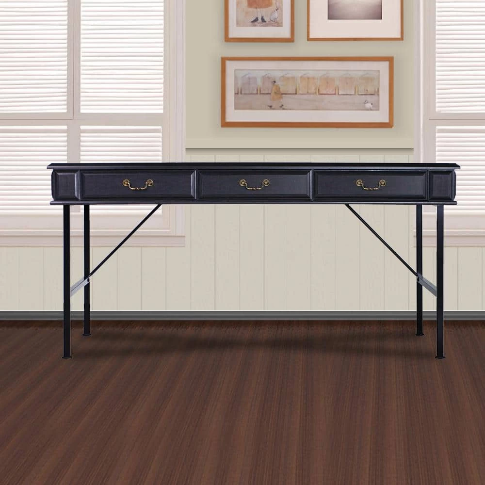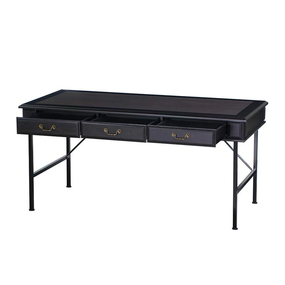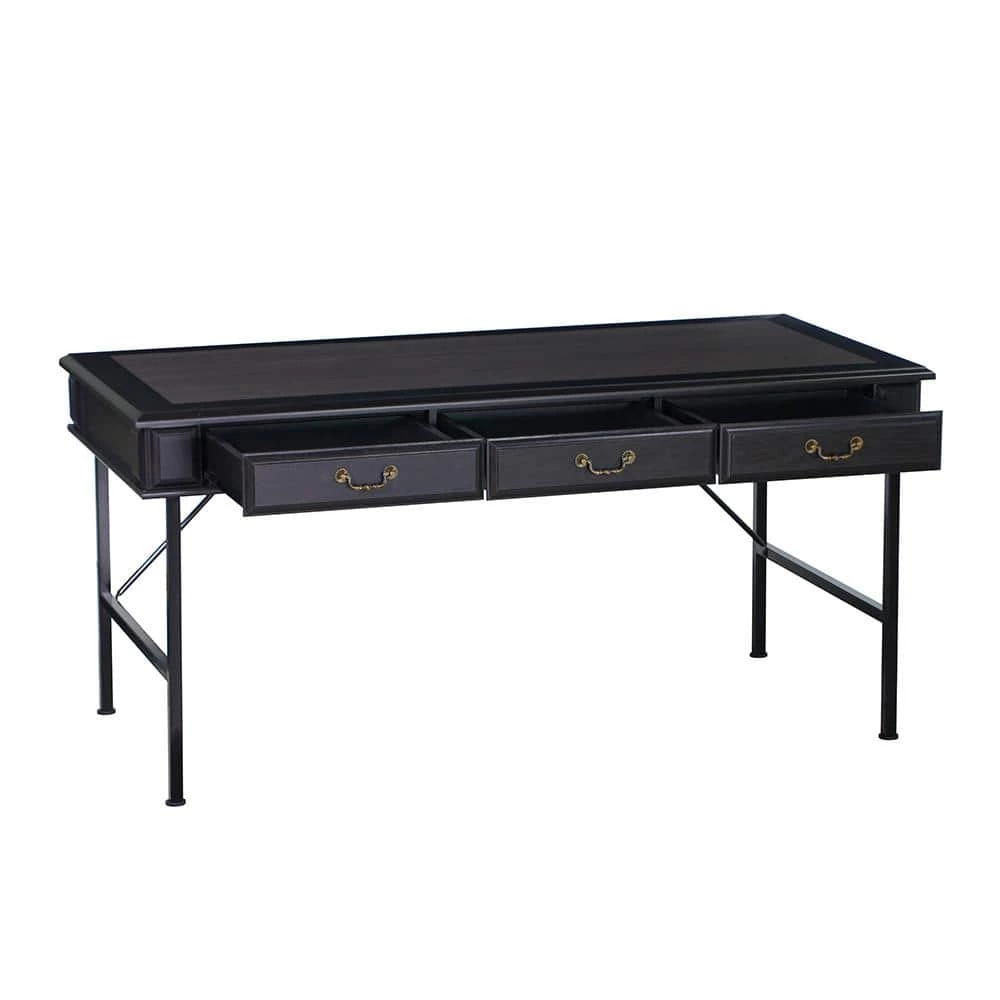 Elevate your home workspace with the chic, elegant look of this espresso finish writing desk. A beautiful blend of classic and contemporary, the desk shows off lovely trim and hardware and sits atop an industrial-inspired metal base that creates a sense of airy lightness in any workspace. Three roomy storage drawers keep everything from pens to small electronics and accessories close at hand for optimal productivity. The scratch-resistant desktop includes a trimmed border, adding the perfect finishing touch.