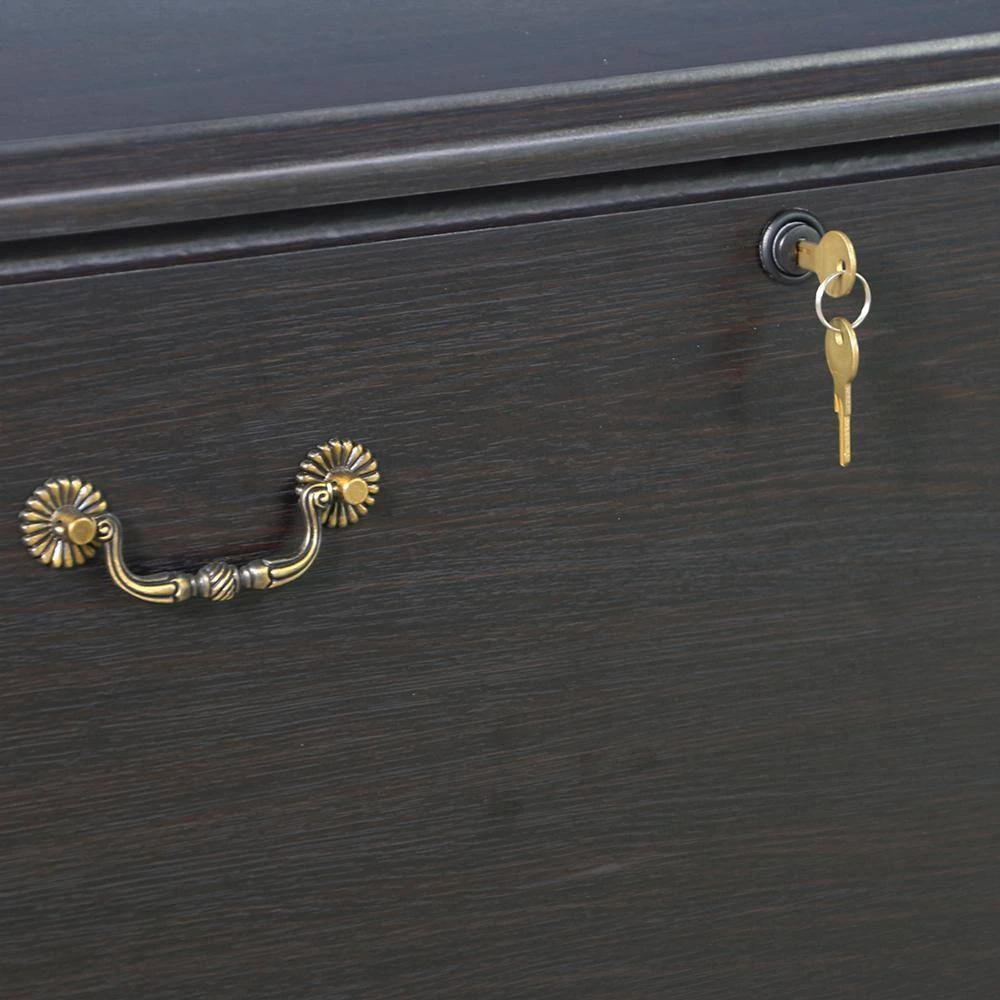 Get organized without compromising style when you choose this espresso finish lateral filing cabinet. With two spacious drawers and a wide top, the cabinet adds ample space for both documentation and decor in your home or professional office. A deep espresso finish is complemented with golden hardware and the cabinet locks to ensure paperwork is kept private. Smooth drawer glides and metal hanging file rails complete this impressive design.