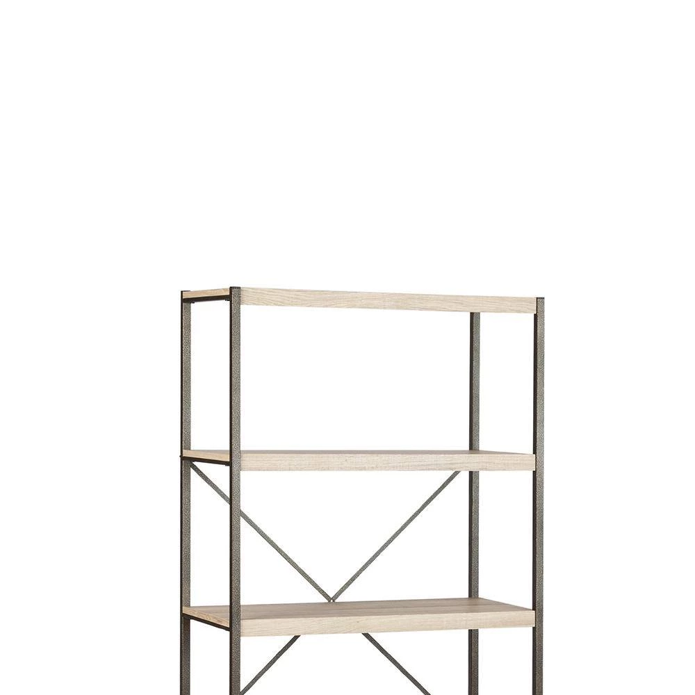 Slim, sleek lines lend modern flair to this beautiful, five-tier bookcase. The dark metal frame creates an attractive contrast with the light oak finish of the shelves. Display photos and keepsakes on its expansive shelves, or simply use them for storage. Whichever way you choose to use it, this piece is sure to elevate the style of any room in your home. Tall and compact, this bookcase shelf unit adds ample storage with a minimal footprint that conserves space in any room.