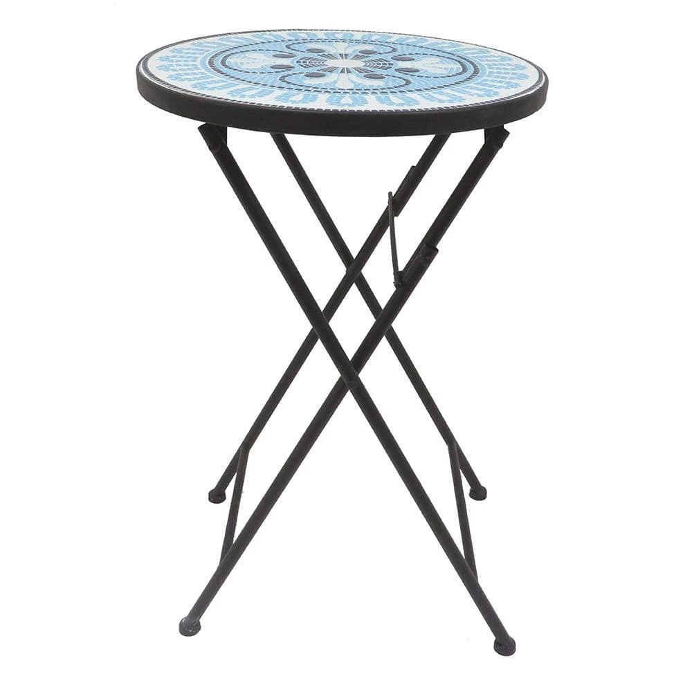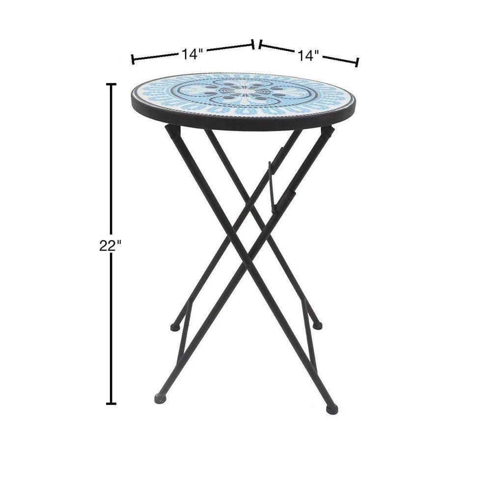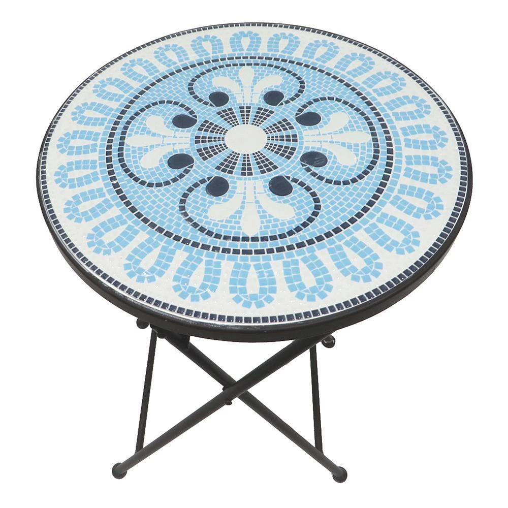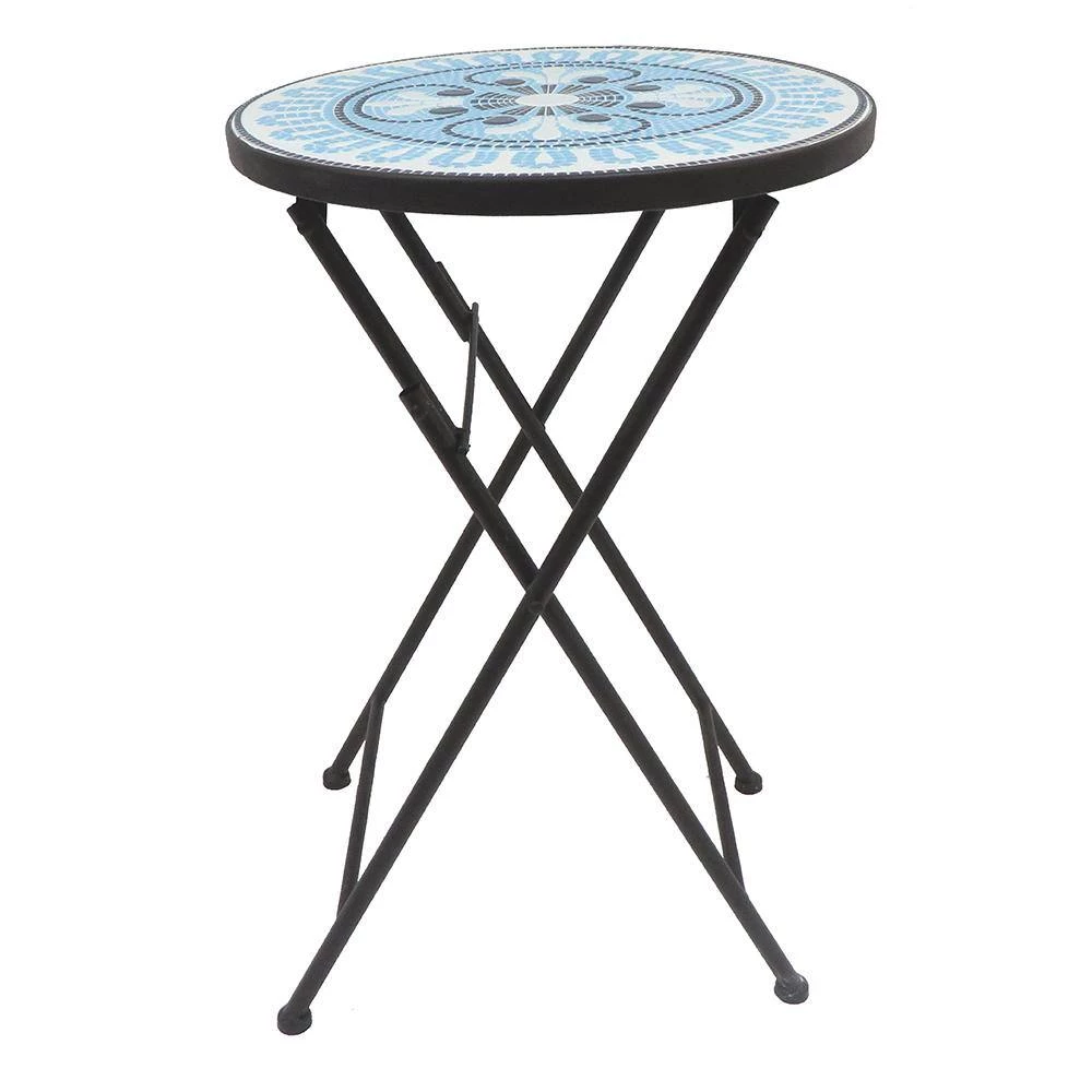 Color, texture, detail, and a compact silhouette — the Lori Mosaic side table has it all. This decorative accent table is perfect for a cup of coffee in the morning sun or a refreshing glass of lemonade on a hot August afternoon. The table features a colorful blue and white tile mosaic design with a classic abstract floral pattern brimming with intricate detail. Because it folds, this transitional table is easy to tuck out of the way when not in use.
